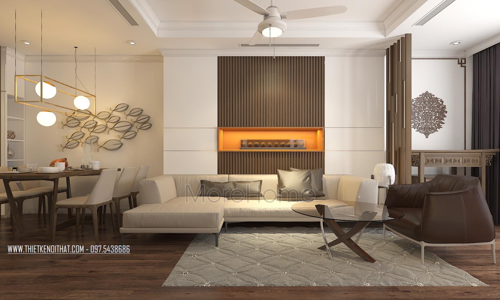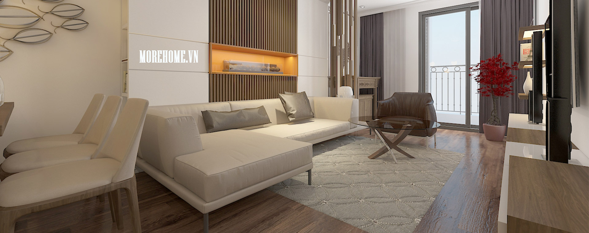 Thiết kế nội thất phòng khách hiện đại gợi mở không gian sống giản đơn, trẻ trung. Các tone màu được kiến trúc sư lựa chọn chủ yếu là các tone màu ấm áp như trắng, nâu trầm từ gỗ, hay sắc vàng nâu, ghi xám,… Tất cả những lựa chọn màu sắc này đều mang đến cảm giác dễ chịu, dịu, ấm. Bộ sofa được lựa chọn có thiết kế đơn giản, không đi sâu vào các chi tiết trang trí hay trạm khắc cầu kỳ mà thay vào đó là thiết kế có khồi hình đơn giản, độ rộng vừa phải, tone màu trắng xám dịu, mang đến cảm giác thoải mái và an toàn, không hề có ý tạo điểm nhấn về mặt thẩm mỹ mà hơn cả gợi cảm giác hài hòa và cân bằng.