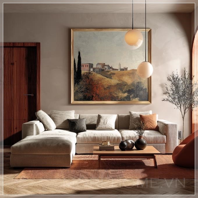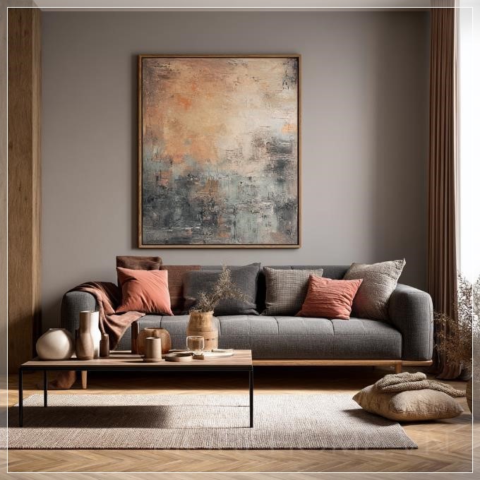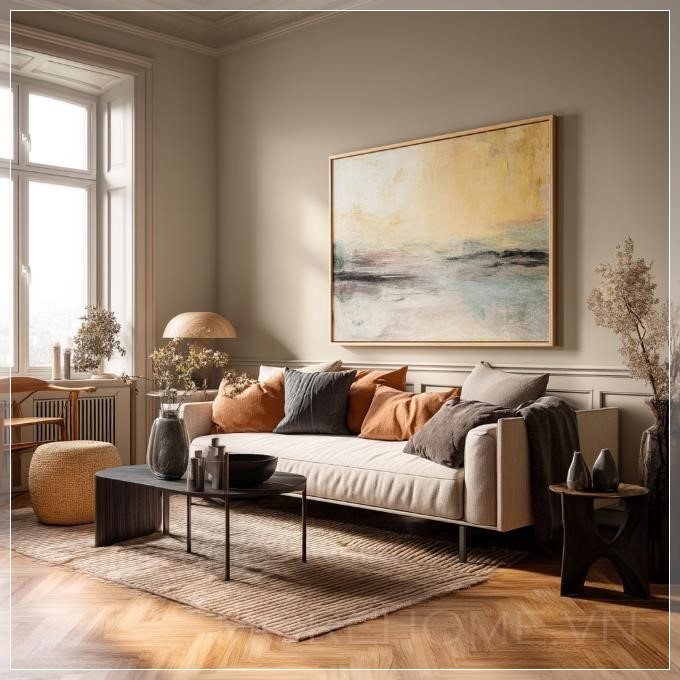 Phòng khách Scandinavian sang trọng, thiết kế nội thất thanh lịch và cao cấp, bảng màu ấm áp, ánh sáng tự nhiên mềm mại, tranh sơn dầu kích thước trung bình với khung gỗ cao cấp treo trên tường phía sau sofa, bàn cà phê phong cách, thảm sàn ấm cúng, các món đồ trang trí được sắp xếp hài hòa, thẩm mỹ tối giản nhưng tinh tế.