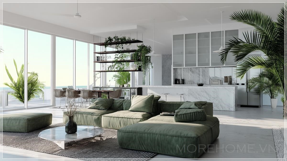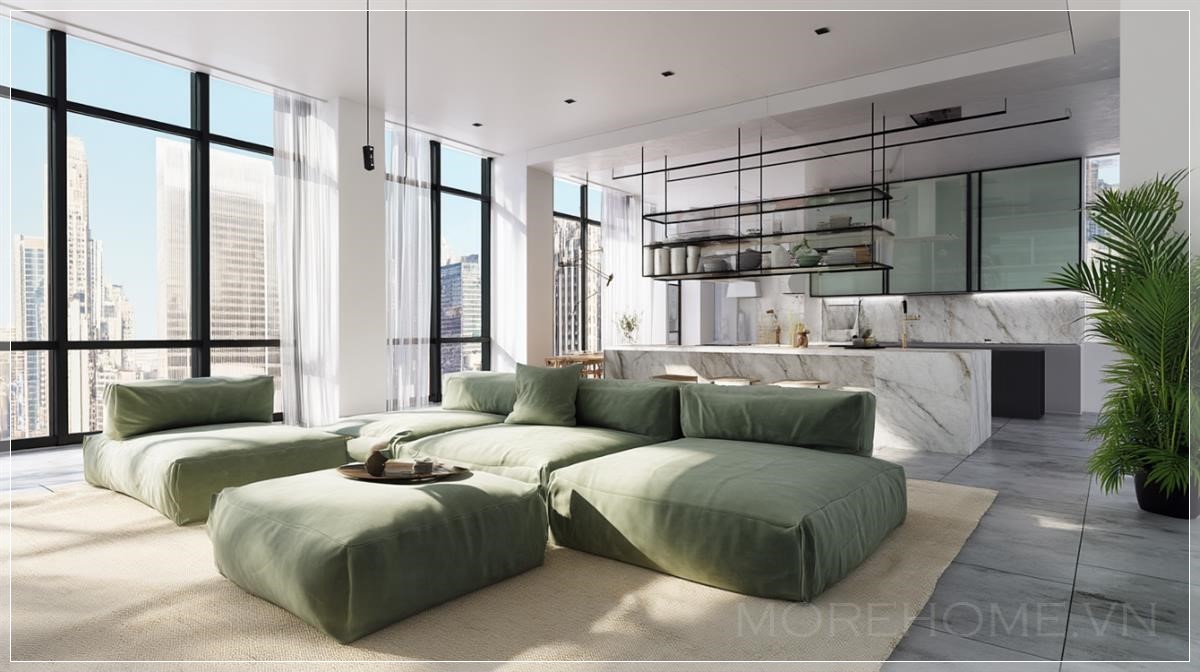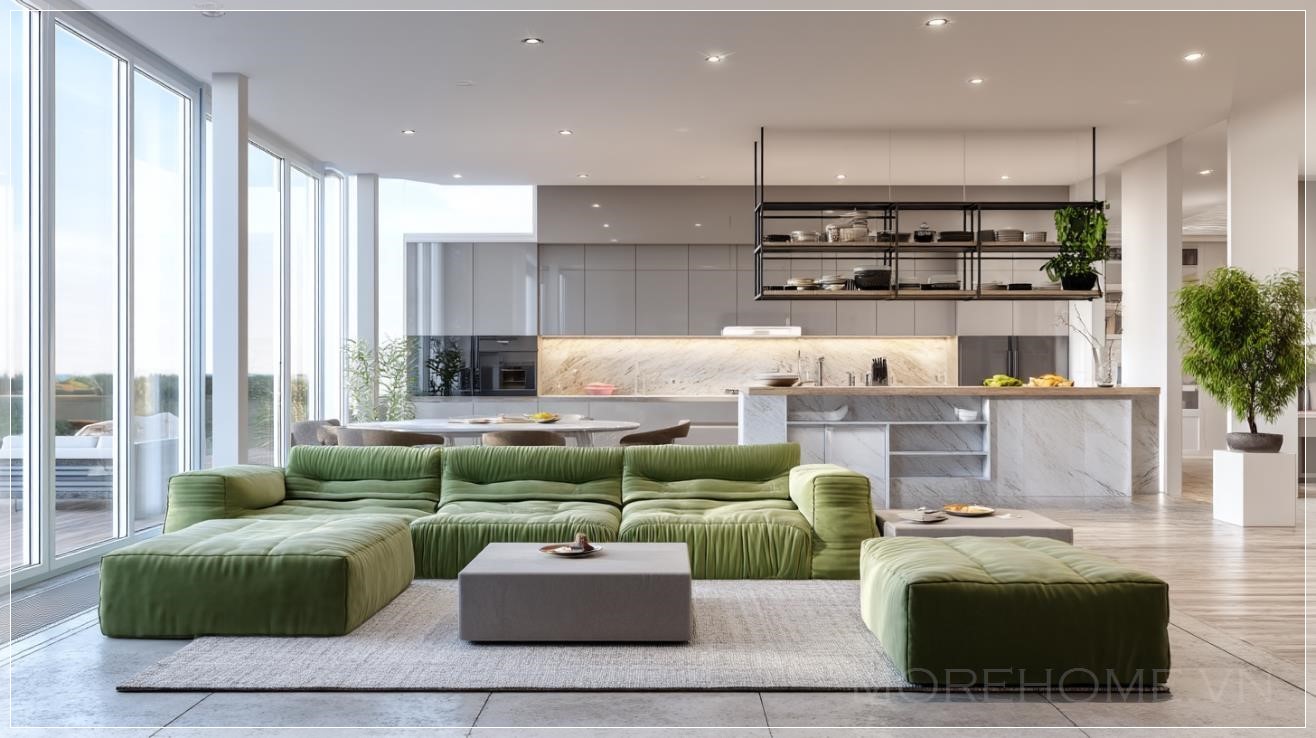 Không gian sống mở hiện đại với ghế sofa modular màu xanh xám mềm mại, bếp tối giản với cửa kính mờ, kệ thép phong cách công nghiệp và mặt bàn bằng đá cẩm thạch. Ánh sáng tự nhiên tràn ngập qua những cửa sổ dài, bổ sung cho bảng màu trung tính và cây xanh trong nhà. Không gian mang lại ấn tượng đương đại và tinh tế.
