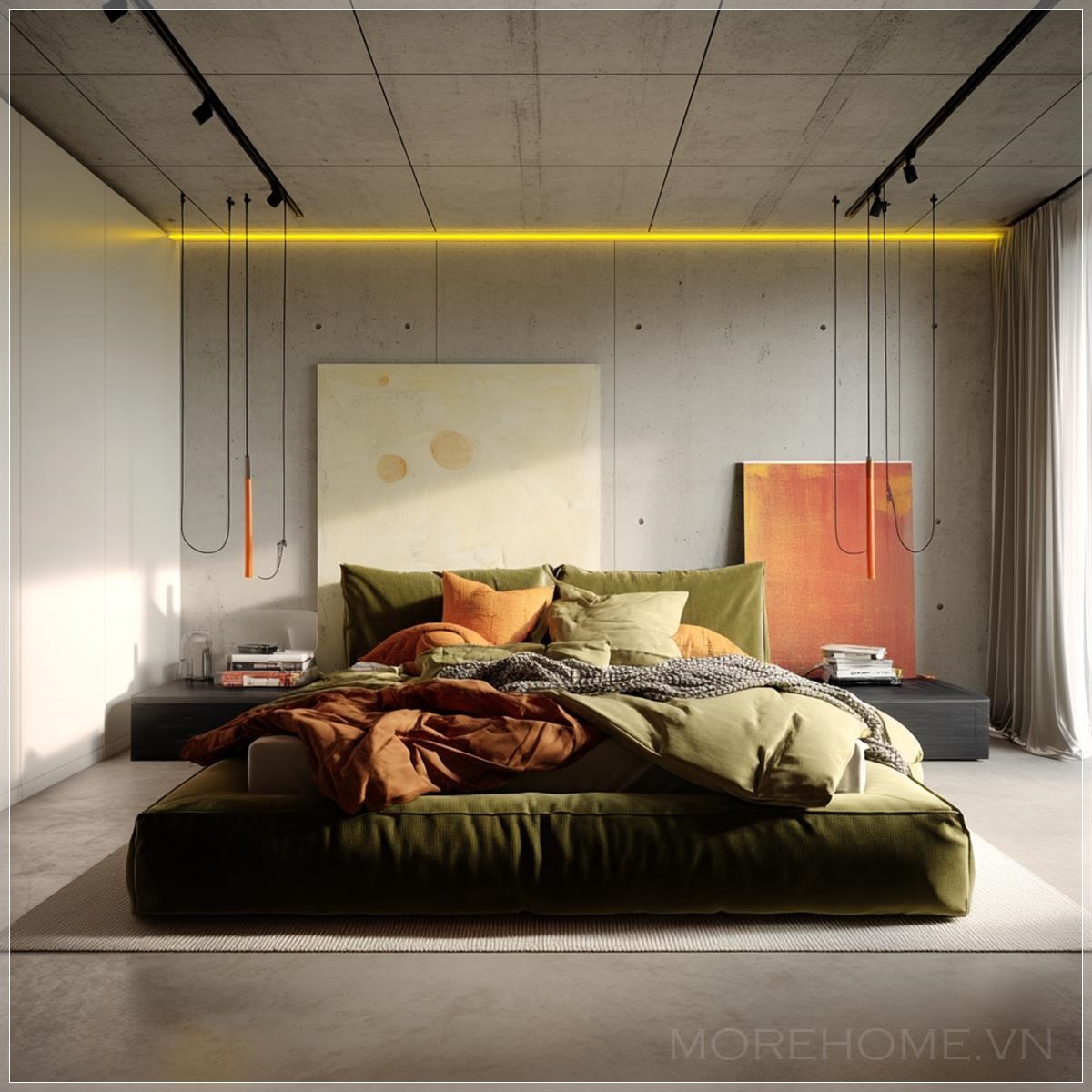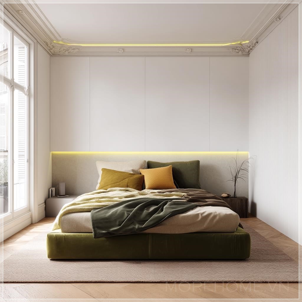Phòng ngủ tối giản thực tế ở Paris với những bức tường trắng lớn và chiếc giường nhung màu olive, các màu sắc chủ đạo là vàng đất, be và olive. Ánh sáng neon vàng dưới trần nhà tạo nên một không gian ấm áp và hiện đại.