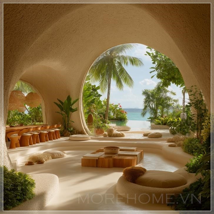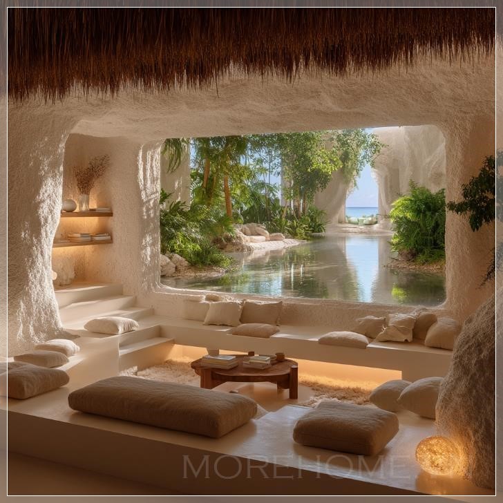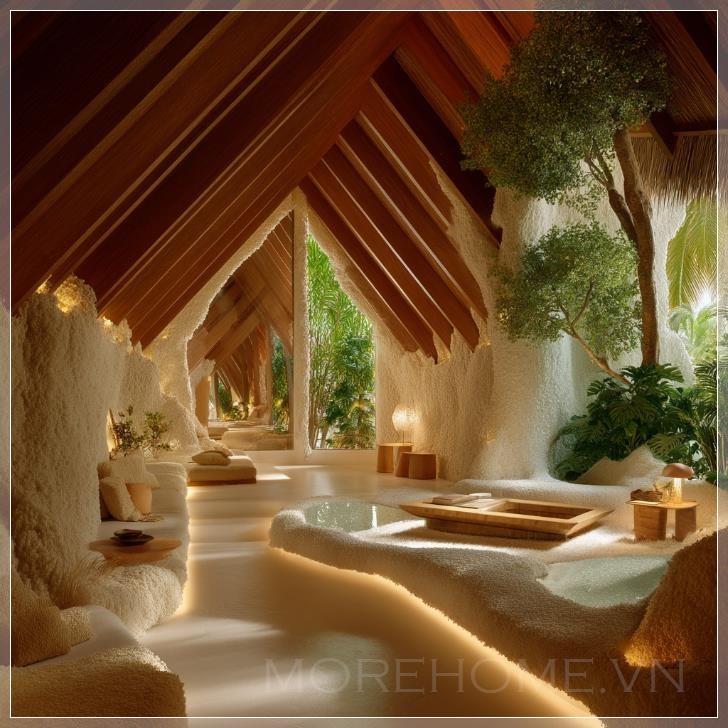 Biệt thự thiết kế nội thất đạt giải thưởng của Kelly Wearstler, phong cách lãng mạn, hiện đại, với tường micro cement trắng táo bạo và gỗ theo thiết kế Mid-century hiện đại kết hợp Japandi, không gian studio được thiết kế bởi Studio MK27, với lò sưởi hạ thấp, nổi trên Maldives, cảnh biển tuyệt đẹp phía sau, mái tranh sáng màu be, không gian mở, các yếu tố thiết kế, không gian studio nghệ thuật hiện đại, và vật liệu tự nhiên hữu cơ, vải mềm mại, nghệ thuật trừu tượng, sang trọng, đèn chiếu sáng ấm áp, ánh sáng gián tiếp ấm áp bên trong, ngày nắng, chi tiết cực kỳ tỉ mỉ, các chi tiết tinh xảo.