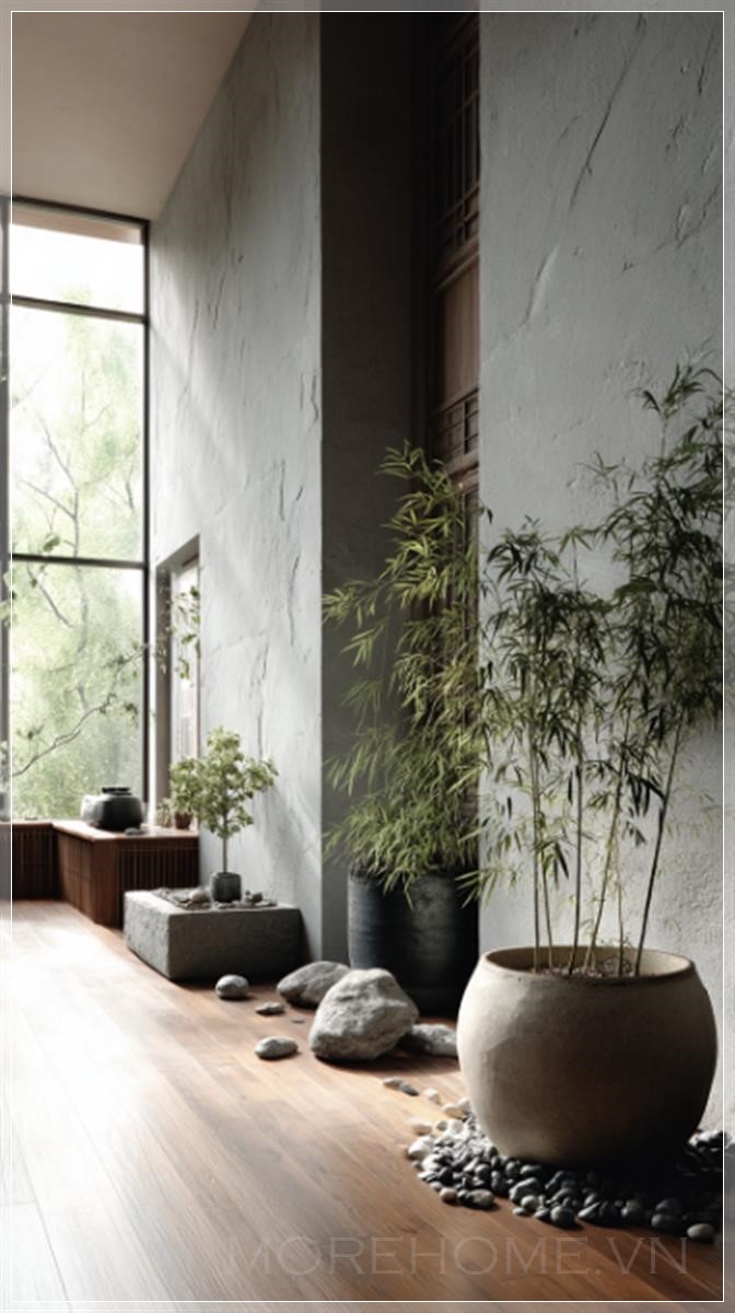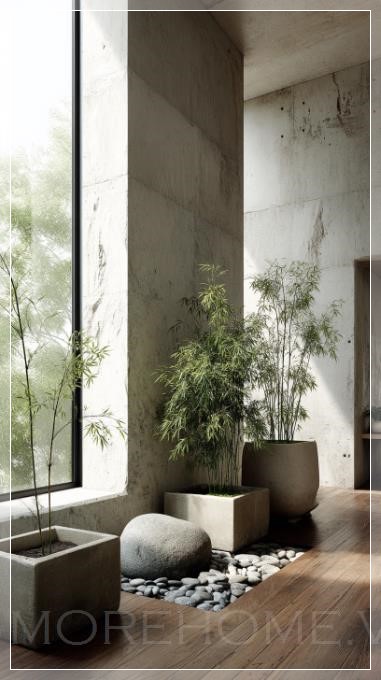 Vẻ đẹp của một khu vườn trong nhà nhỏ với cây tre, nền tường đá xám, sàn gỗ, những viên đá trang trí và sỏi xung quanh gốc cây. Một cửa sổ lớn ở một bên cho phép ánh sáng ban ngày chiếu vào, nhìn ra ngoài. Không gian mang cảm giác thiết kế hiện đại, với độ phân giải cao và chất lượng ảnh tuyệt vời. Cảnh vật được chụp từ một góc rộng, mang lại một cái nhìn toàn cảnh đầy đủ chi tiết, với ánh sáng tự nhiên chiếu rọi, tạo nên một bức ảnh siêu thực và chi tiết. Cảnh vật mang phong cách chuyên nghiệp với những chi tiết hoàn hảo và tinh tế, được thực hiện bởi nhiếp ảnh gia Iwan Baan.