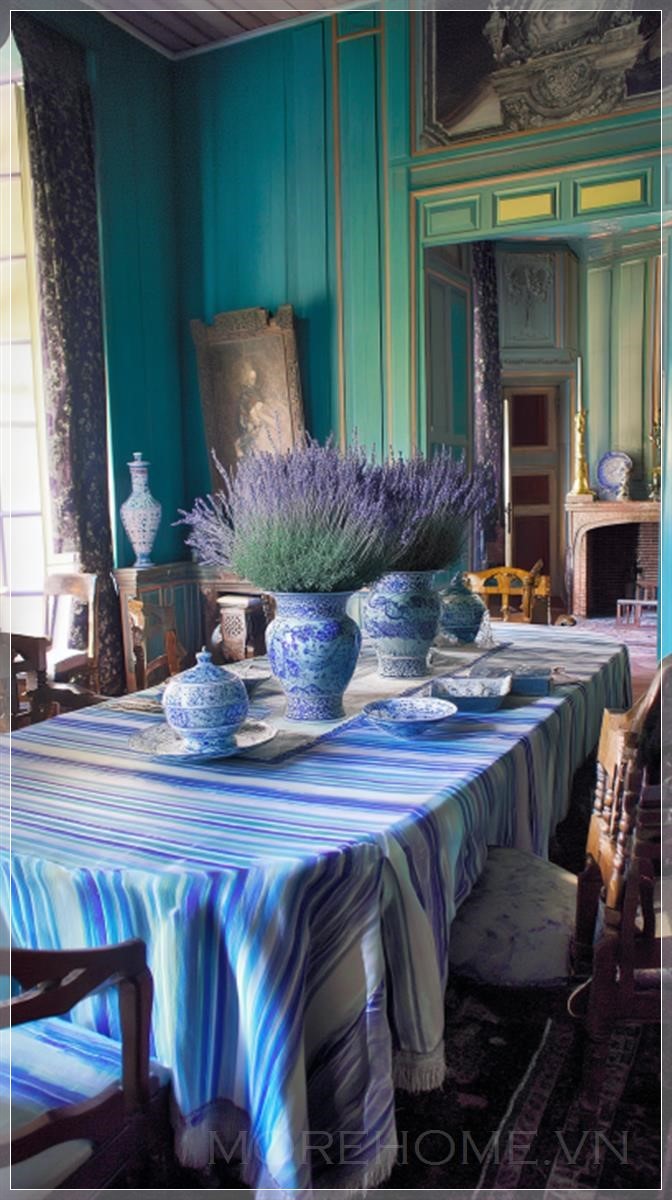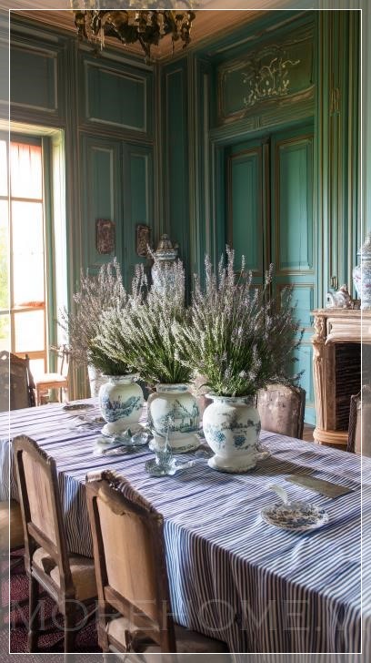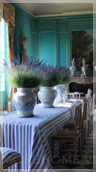 Phòng ăn trong một lâu đài Pháp cổ với khăn trải bàn sọc xanh trắng, những chiếc bình sứ lớn chứa hoa oải hương trên bàn, những chiếc ghế cổ xung quanh, tường được sơn màu xanh ngọc sâu, theo phong cách Renaissance.