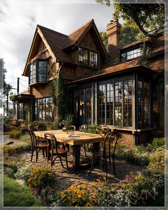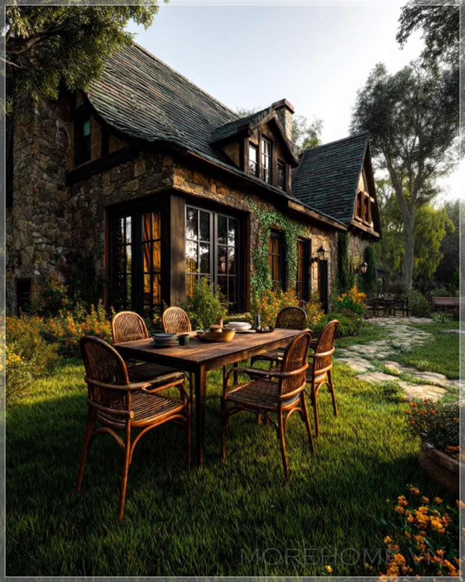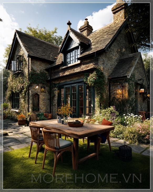 Ảnh chụp 4K siêu thực của một ngôi nhà gỗ ấm cúng nằm trong một khu vườn hoa tươi tốt, có một bàn ăn và ghế gỗ đặt trên bãi cỏ được chăm sóc kỹ lưỡng. Ánh sáng giữa trưa rực rỡ chiếu sáng không gian, tạo ra ánh sáng điện ảnh với dải tương phản động cao, chỉnh sửa tối thiểu, góc nhìn chính diện toàn bộ ngôi nhà.