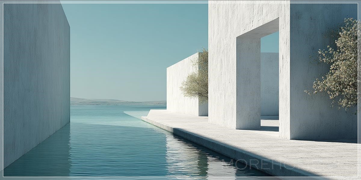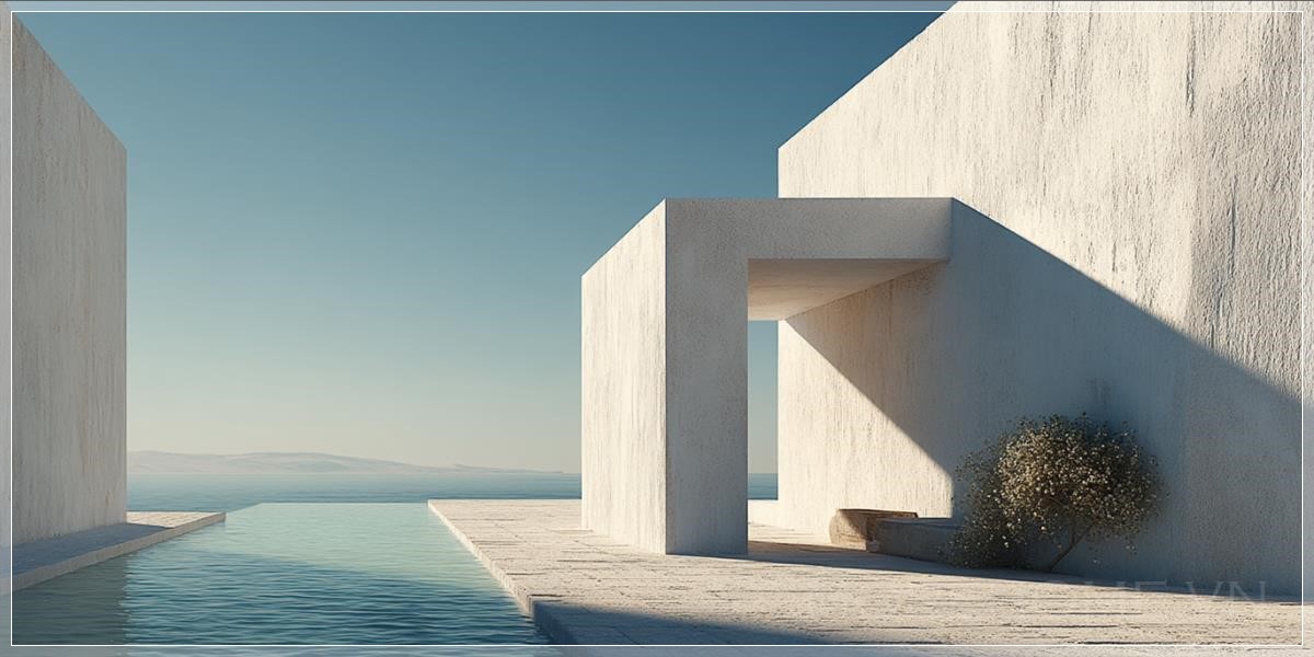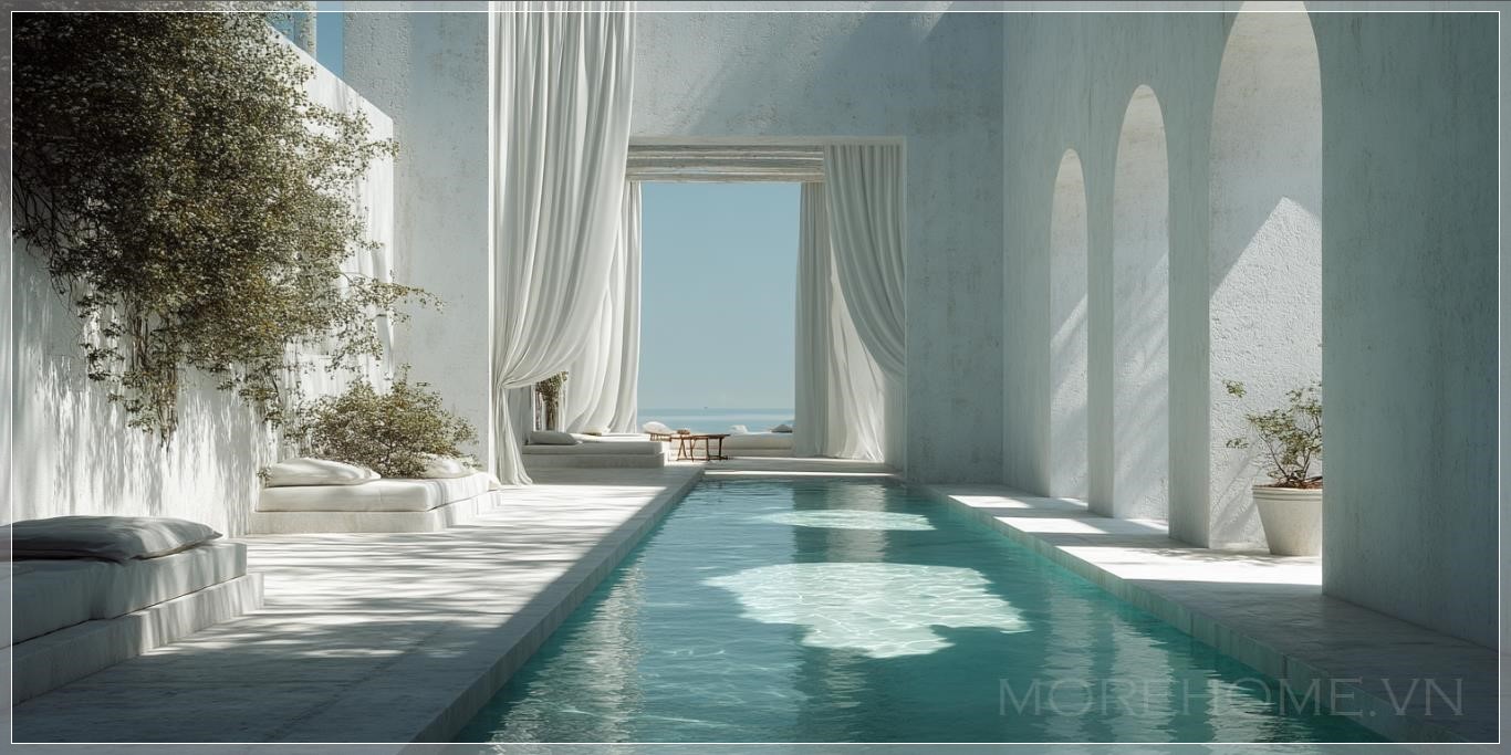 Nhiếp ảnh biên tập chi tiết của một cổng vào trong biệt thự tối giản màu trắng, với một bể bơi dài ở giữa, trên một hòn đảo Hy Lạp, nhìn ra biển Địa Trung Hải vào một ngày hè, đường nét sạch sẽ, theo phong cách của Aires Mateus, tông màu xanh nhạt, ánh sáng dịu nhẹ, ánh sáng tự nhiên, màu pastel, bóng tối, ánh sáng mặt trời, bao quanh bởi biển vào một ngày nắng với bầu trời xanh và màu sắc nhẹ nhàng, một tòa nhà Hy Lạp cổ kính với các cột trong tình trạng đổ nát ở phía xa, rèm trắng lớn phủ kín toàn bộ cửa sổ thổi trong gió, một phần của tòa nhà được phủ đầy cây thường xuân với những bông hoa trắng, với cửa sổ hình hồng.