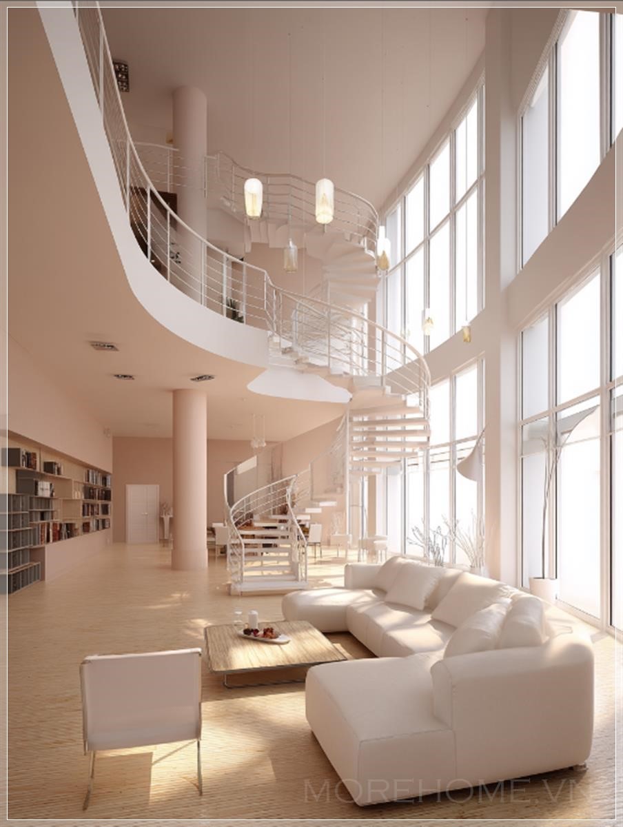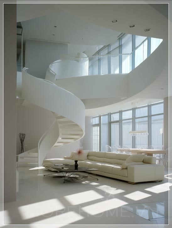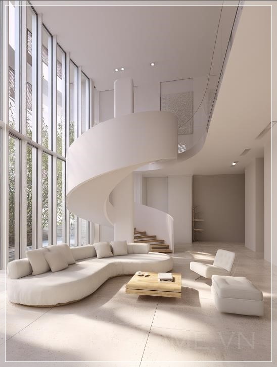 Phòng khách theo phong cách tối giản hiện đại có cầu thang xoắn trắng đôi ở tầng một, với ghế sofa và bàn cà phê. Cửa sổ kính lớn ở tầng hai cung cấp ánh sáng tự nhiên dồi dào, chiếu sáng lên các bức tường màu be nhạt và tạo nên một không gian ấm cúng, mời gọi. Trần cong và không gian rộng rãi giúp tạo ra một khu vực ngồi thoải mái, lý tưởng cho những buổi chụp ảnh kiểu tạp chí thiết kế nội thất.