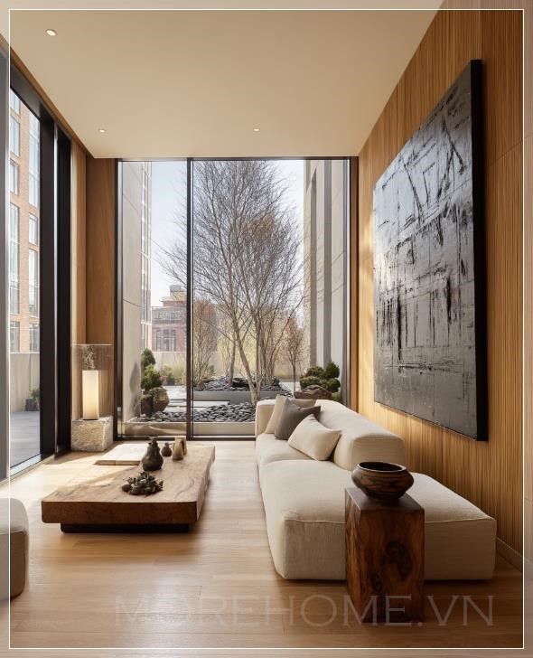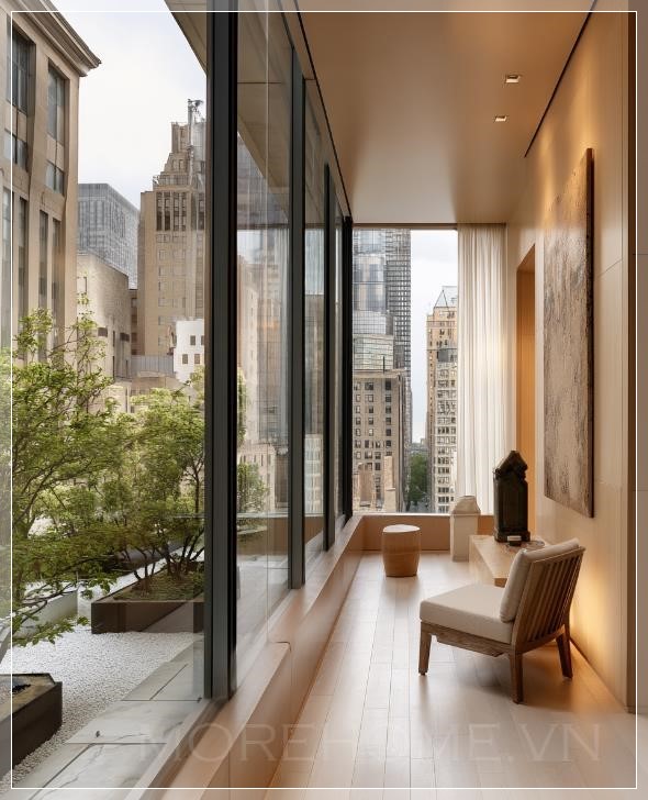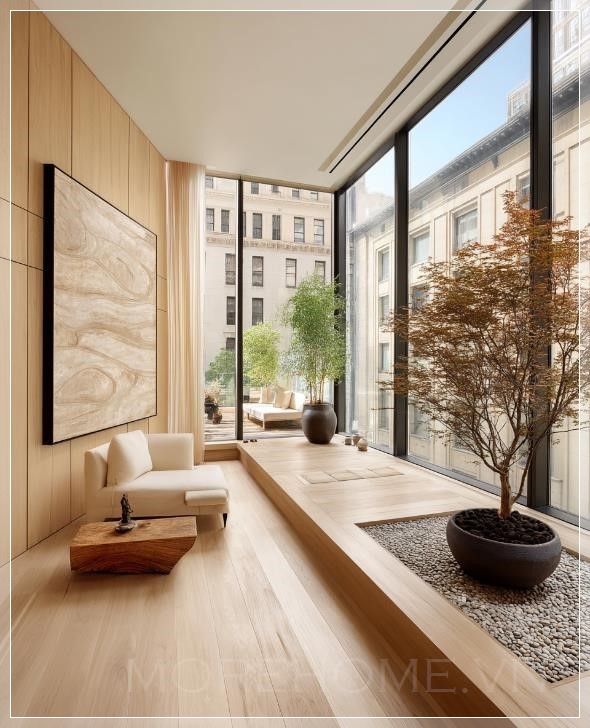 Một không gian nội thất sang trọng trong căn hộ ở New York City với cửa sổ từ trần đến sàn, đồ nội thất tối giản, tường được ốp gỗ, tác phẩm nghệ thuật trừu tượng lớn và một ban công với cây xanh cùng vườn zen. Cảnh vật rất chân thực, tươi mới, như một bức ảnh chụp bằng máy Canon EOS R5 Mark II cho bài viết của Architectural Digest.