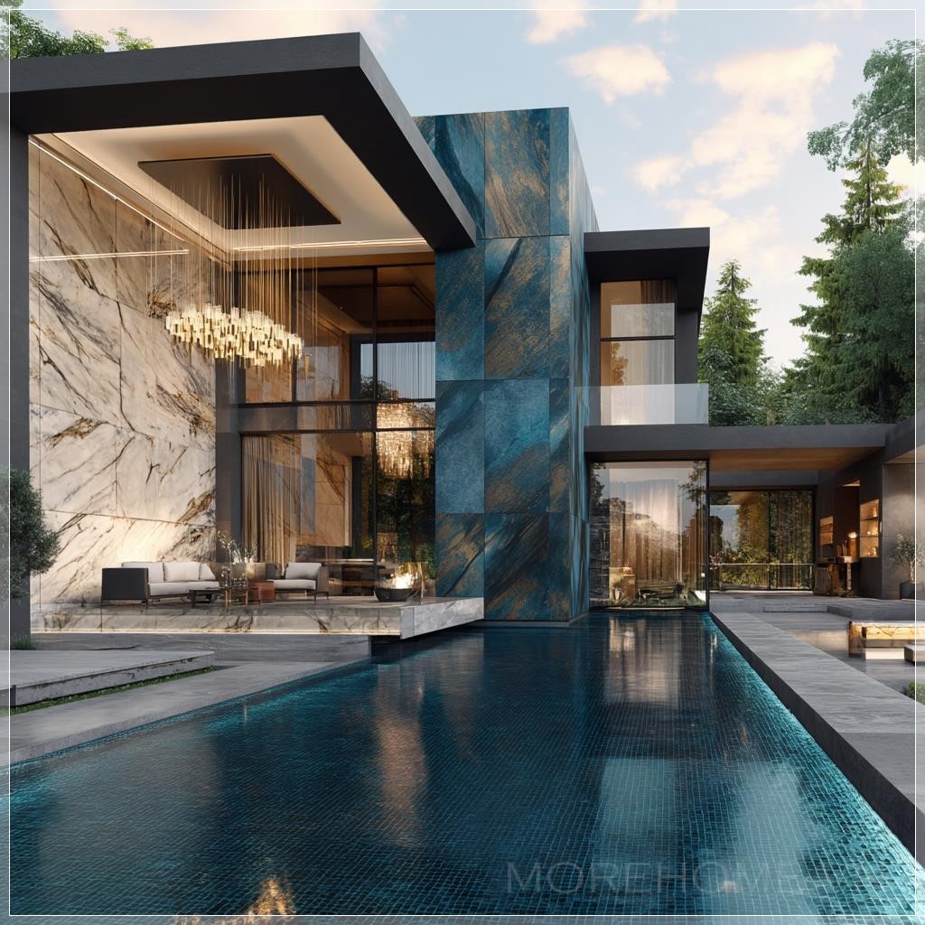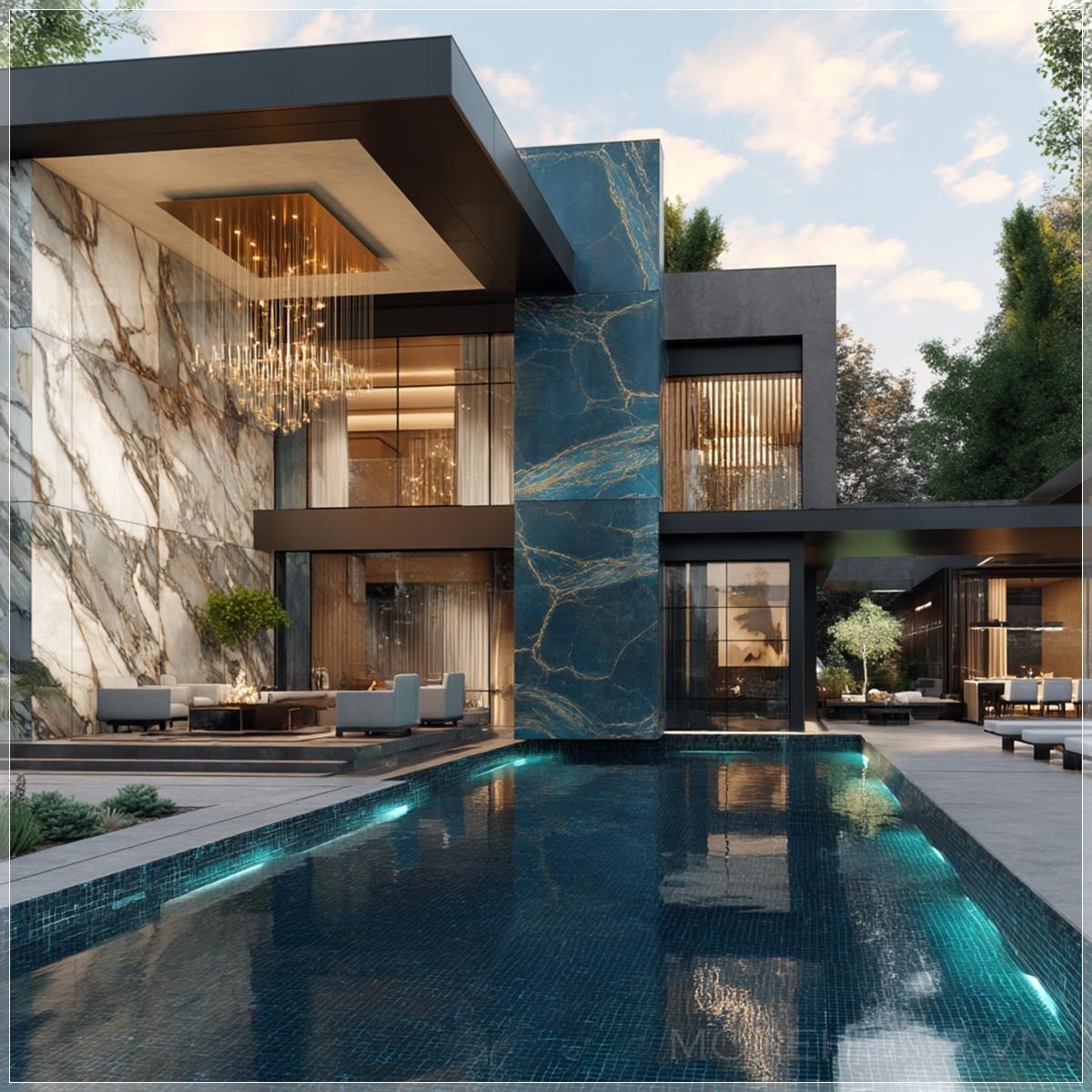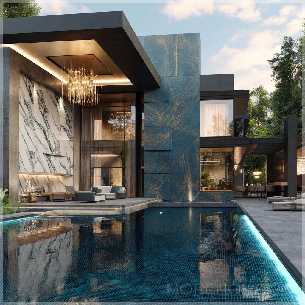 Chụp ảnh ngoại thất của một biệt thự hiện đại, thực hiện vào buổi sáng, trong thời tiết mát mẻ và ngày nắng sớm, với khu rừng xanh tươi bạt ngàn làm nền. Biệt thự có tường đá marble đen-trắng sang trọng, cửa sổ kính lớn và đèn chùm lớn ở phòng khách. Bức ảnh có tông màu đất ấm với các điểm nhấn xanh đậm, hồ bơi lớn với gạch mosaic xanh đậm, ánh sáng phản chiếu lên tường tạo ra những vệt sáng. Máy ảnh được đặt ở vị trí thấp để ghi lại chiều cao của ngôi nhà, sử dụng máy DSLR full-frame với cài đặt chất lượng cao nhất, tốc độ chụp 1/125, khẩu độ f/8, cân bằng trắng điều chỉnh để đảm bảo màu sắc trung thực trong các điều kiện ánh sáng khác nhau, ống kính prime (ví dụ 50mm hoặc 85mm) để sắc nét chi tiết các yếu tố kiến trúc cụ thể, bức ảnh có độ tương phản tốt, phong cách chụp tạp chí.