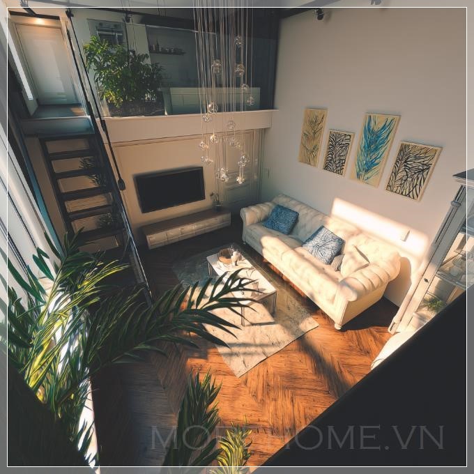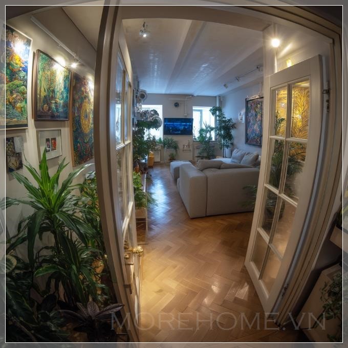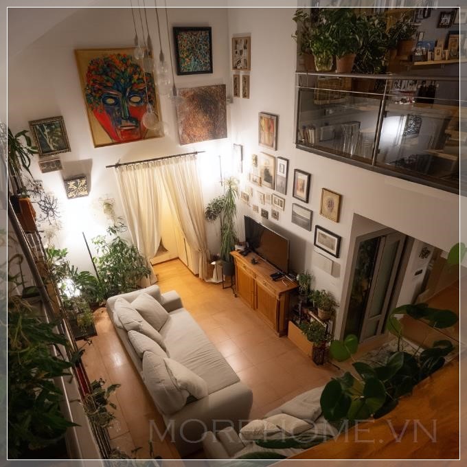 Một căn hộ duplex với cửa phòng tắm hơi mở một chút ở tầng một, phòng khách ở giữa, sofa vải dễ thương, TV Sony treo trên không đối diện với sofa. Cửa sổ kiểu Pháp ở một bên, phòng ngủ ở tầng hai, tranh nghệ thuật kỳ lạ, đồ trang trí nghệ thuật, cây xanh tươi mát, trang trí tinh tế khắp ngôi nhà. Bếp mở ở tầng một, ánh sáng ấm áp, cảnh đêm, độ phân giải 8K siêu rõ nét, tỷ lệ 16:9.