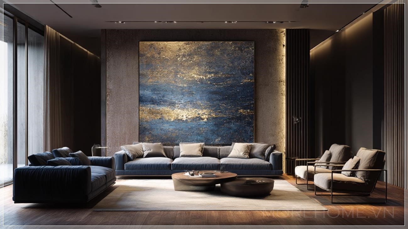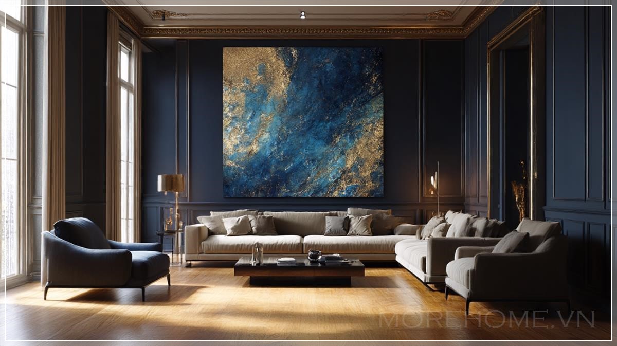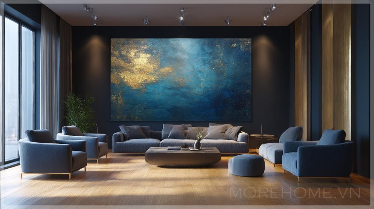 Phòng khách sang trọng, nội thất hiện đại cao cấp, bức tranh trừu tượng chiếm lấy toàn bộ bức tường trung tâm với sắc xanh đậm và vàng kim loại, ánh sáng tự nhiên tạo không gian ấm cúng, sàn gỗ bóng loáng, không gian mang đậm vẻ huyền bí nhưng tinh tế, bức tranh tạo ra một cảm giác suy tư, nội tâm.