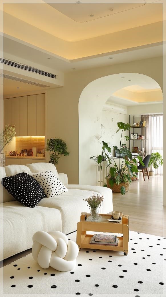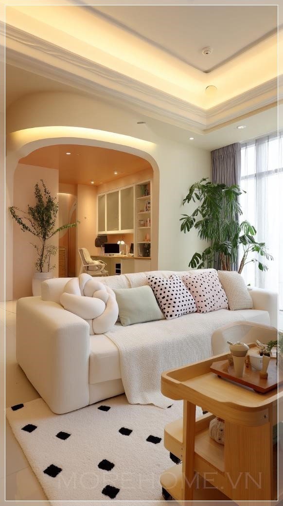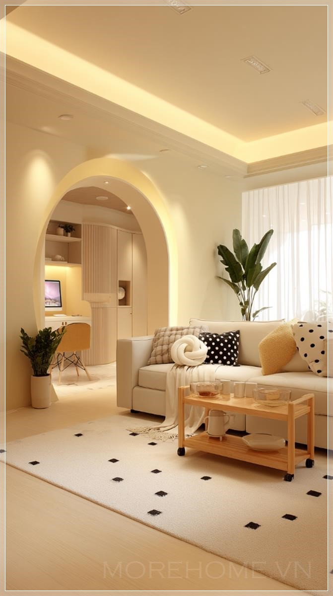 Phòng khách hiện đại ấm cúng với bảng màu kem mềm mại, nổi bật với một chiếc sofa bọc vải màu trắng ngà lớn, được trang trí với những chiếc gối ném vui nhộn, bao gồm kiểu chấm bi và nút thắt. Một chiếc xe trà bằng gỗ sáng được đặt trên tấm thảm trắng có họa tiết ô vuông đen, tạo điểm nhấn đồ họa. Ánh sáng cove gián tiếp chiếu sáng kiến trúc trần nhiều lớp, tạo ra ánh sáng dịu ấm. Một lỗ cắt trên tường cong trong không gian nội thất hé lộ một phần không gian làm việc liền kề với tủ bếp tông màu nhạt và bộ máy tính. Cây xanh trong chậu tăng thêm cảm giác tự nhiên và mời gọi. Shot với Canon 5D, ống kính RF 24-70mm, f11.