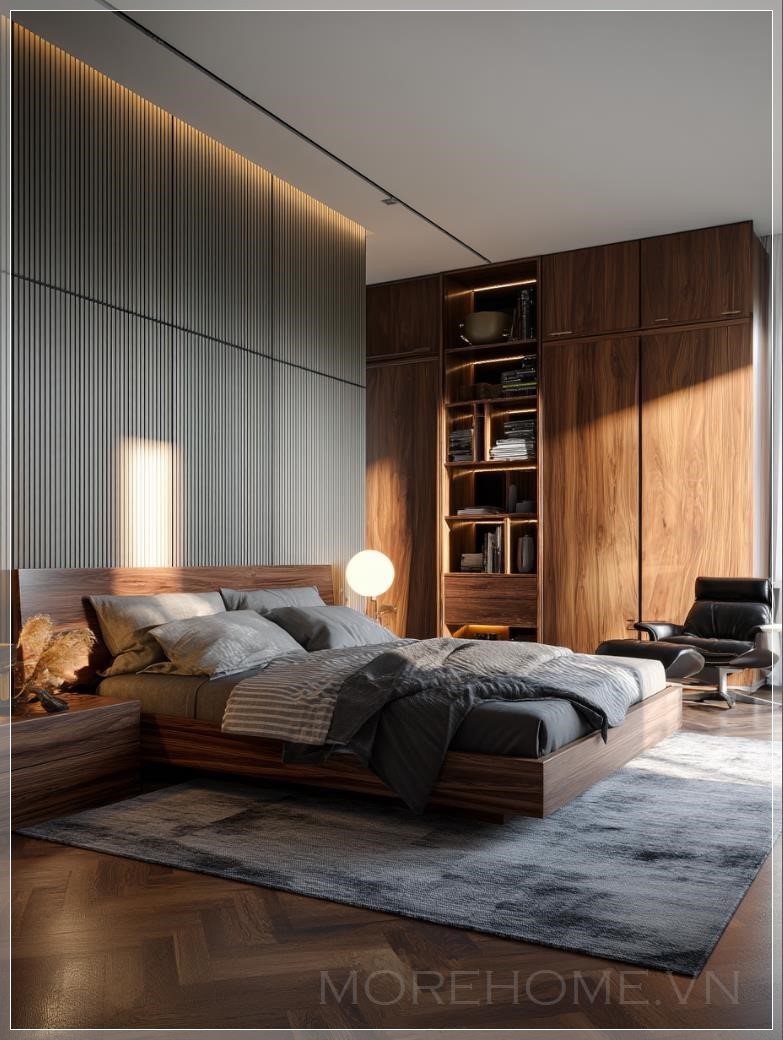 Khi thiết kế phòng ngủ với gỗ, đừng quên rằng tính cá nhân hóa là chìa khóa. Một chiếc tủ quần áo được thiết kế riêng, phù hợp với không gian và nhu cầu cá nhân, không chỉ tối ưu hóa diện tích mà còn là điểm nhấn thẩm mỹ. Tay nắm tủ bằng đồng cổ trên nền gỗ sẫm màu tạo nên chi tiết nhỏ nhưng đầy tinh tế.