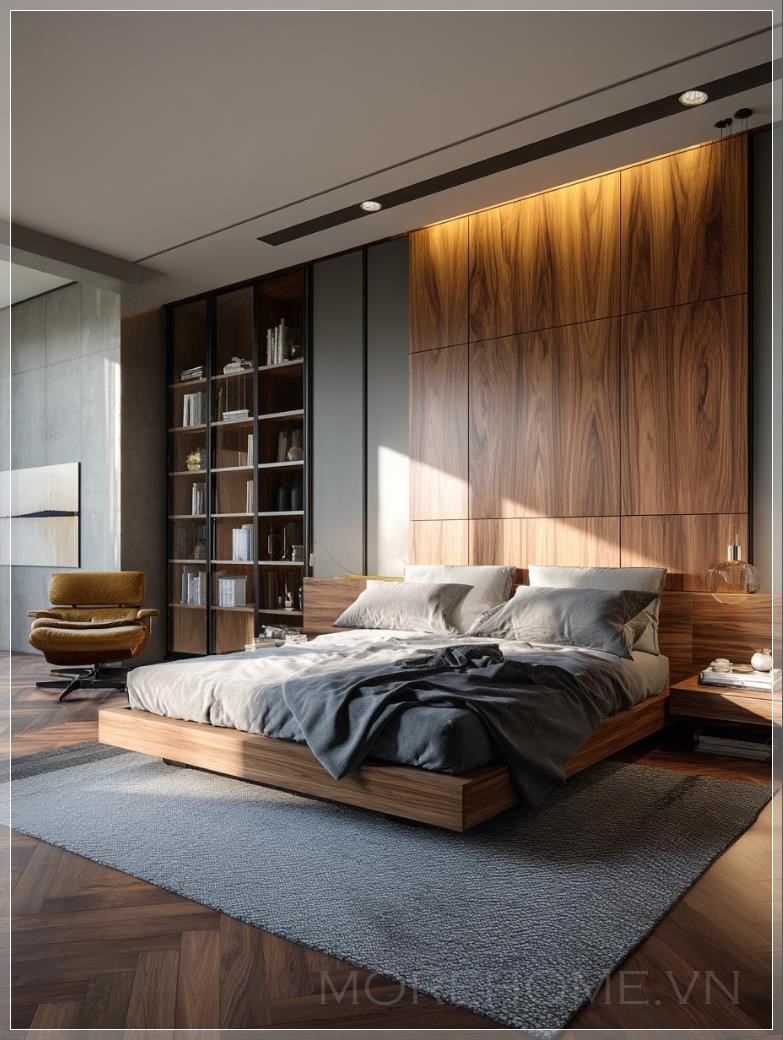 Điều làm nên sức hút của một phòng ngủ hiện đại với gỗ chính là sự cân bằng. Sàn gỗ ấm áp dưới chân, tương phản nhẹ nhàng với tường sơn màu trung tính như xám nhạt hoặc kem. Tranh treo tường với khung gỗ mỏng tạo điểm nhấn thị giác, trong khi rèm cửa bằng vải tự nhiên lọc ánh sáng, tạo nên bầu không khí yên bình.