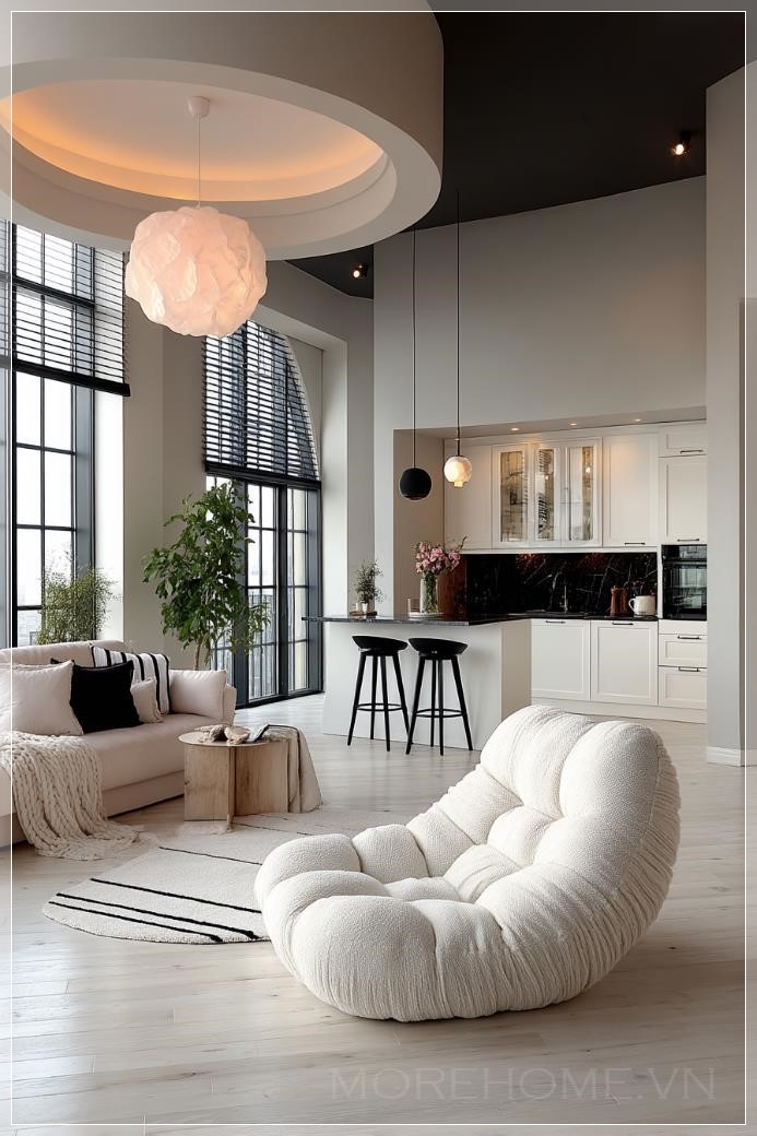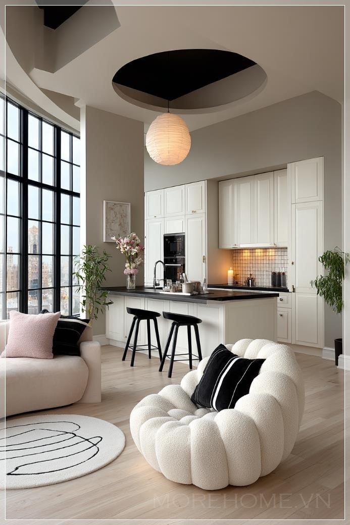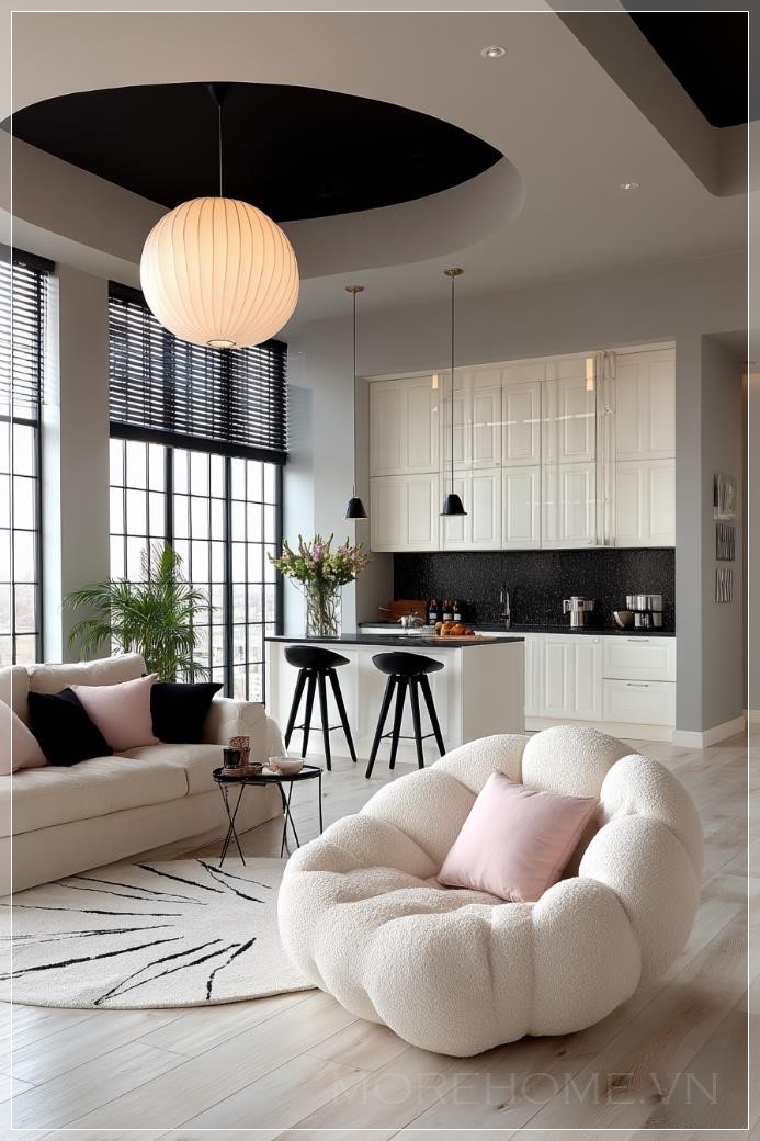 Một điểm nhấn đáng chú ý khác trong căn hộ này là chi tiết trang trí hình tròn màu đen trên trần nhà, nơi đặt chiếc đèn thả màu trắng mềm mại. Yếu tố này không chỉ đóng vai trò chiếu sáng mà còn là tác phẩm nghệ thuật, tạo nên điểm nhìn thú vị khi ngước lên. Sự kết hợp giữa hình khối tròn và các đường nét mềm mại trong thiết kế tạo nên sự cân bằng hoàn hảo, phá vỡ sự cứng nhắc thường thấy trong các thiết kế hiện đại.