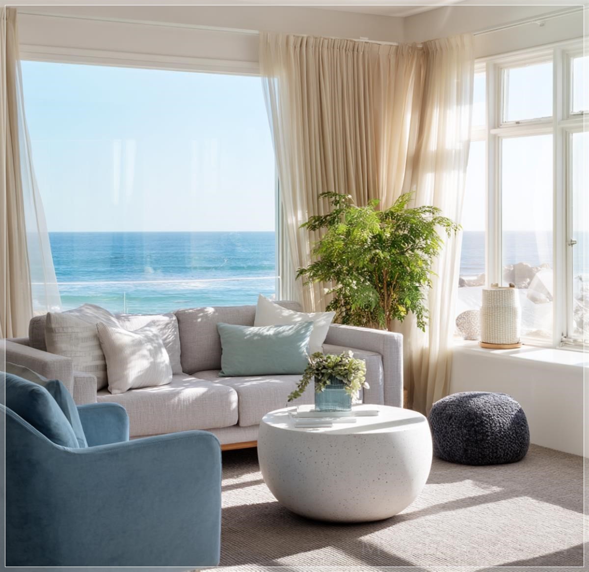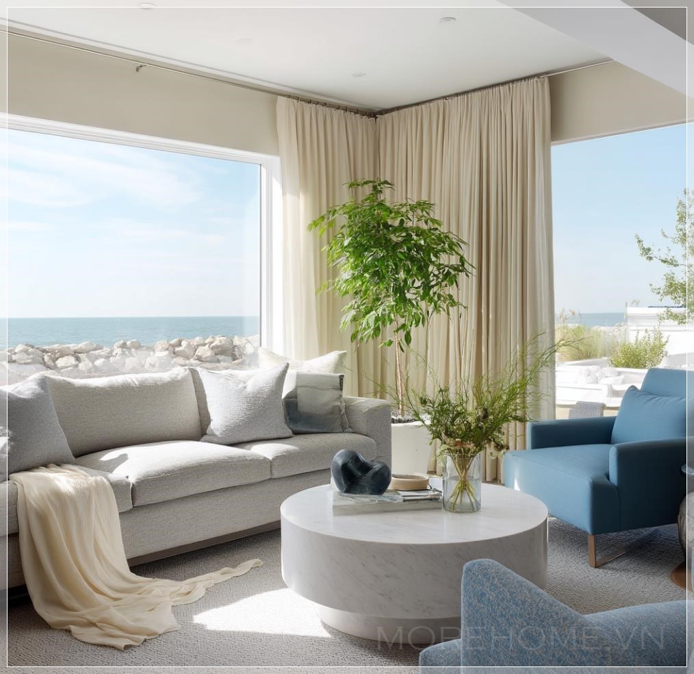 Khi ánh nắng rực rỡ len lỏi qua những tấm rèm màu be nhạt, cả căn phòng khách ven biển bỗng trở nên sống động với hơi thở của đại dương. Đây là nơi mà ranh giới giữa thiên nhiên và không gian sống dường như tan biến, tạo nên một bản hòa tấu tinh tế của ánh sáng, không khí và sự thanh bình.