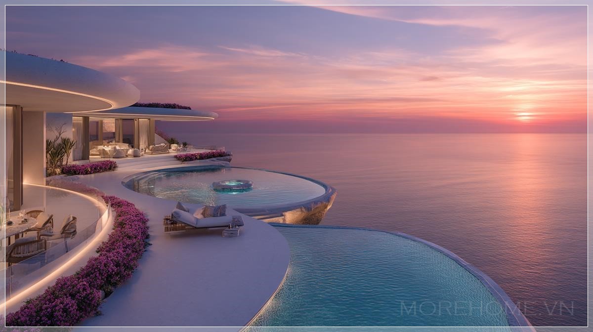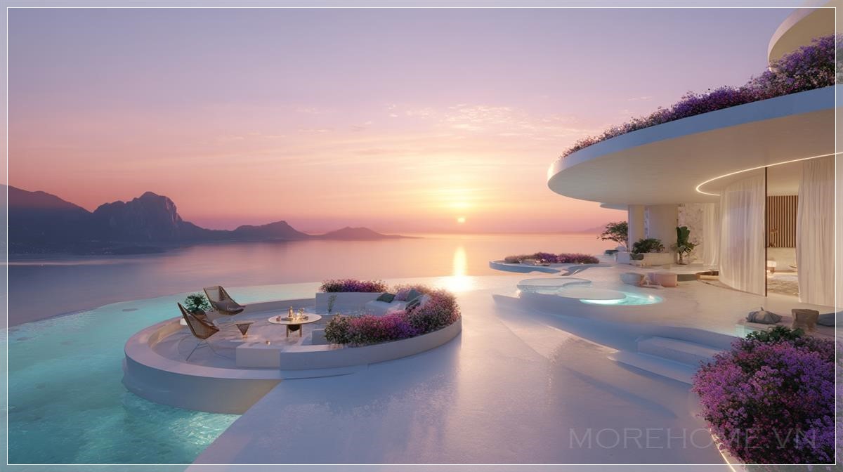 Điểm nhấn của biệt thự chính là hai sân thượng hình tròn được thiết kế tinh tế. Mỗi sân thượng đều được trang trí bằng những khóm hoa rực rỡ, tạo nên không gian sống động đầy màu sắc giữa tone màu xanh của biển cả. Tại mỗi đầu sân thượng là một hồ bơi nhỏ hình tròn, phản chiếu ánh hoàng hôn, như những tấm gương khổng lồ phản chiếu bầu trời đang chuyển màu.