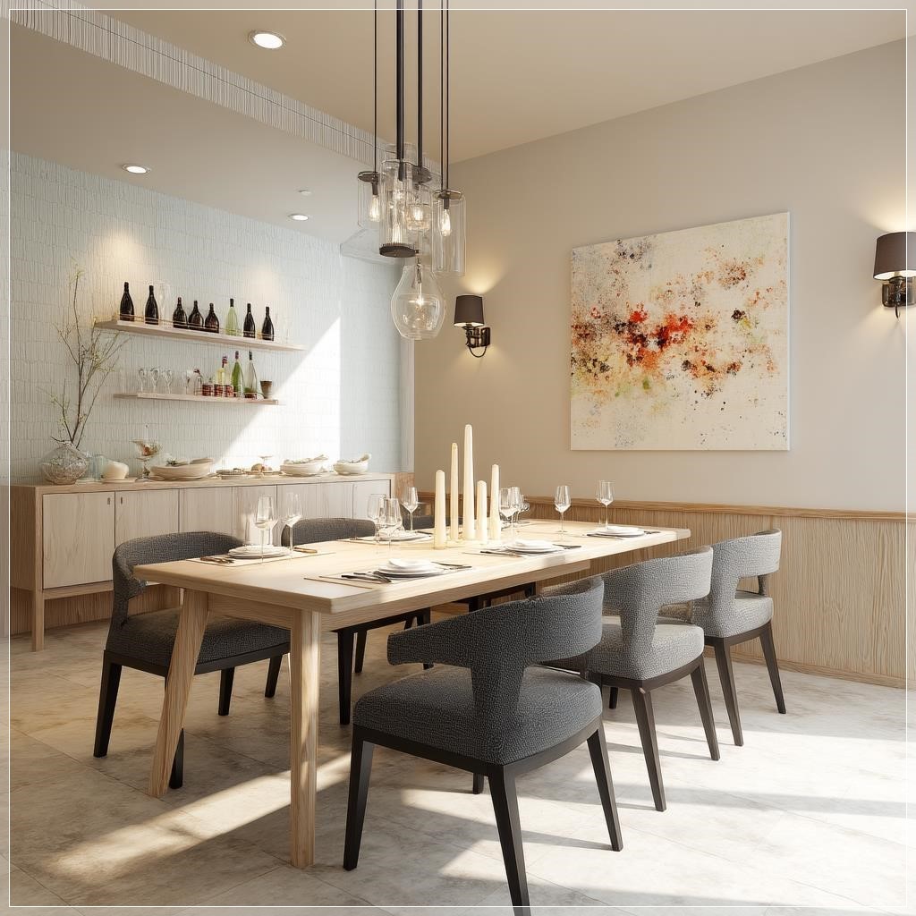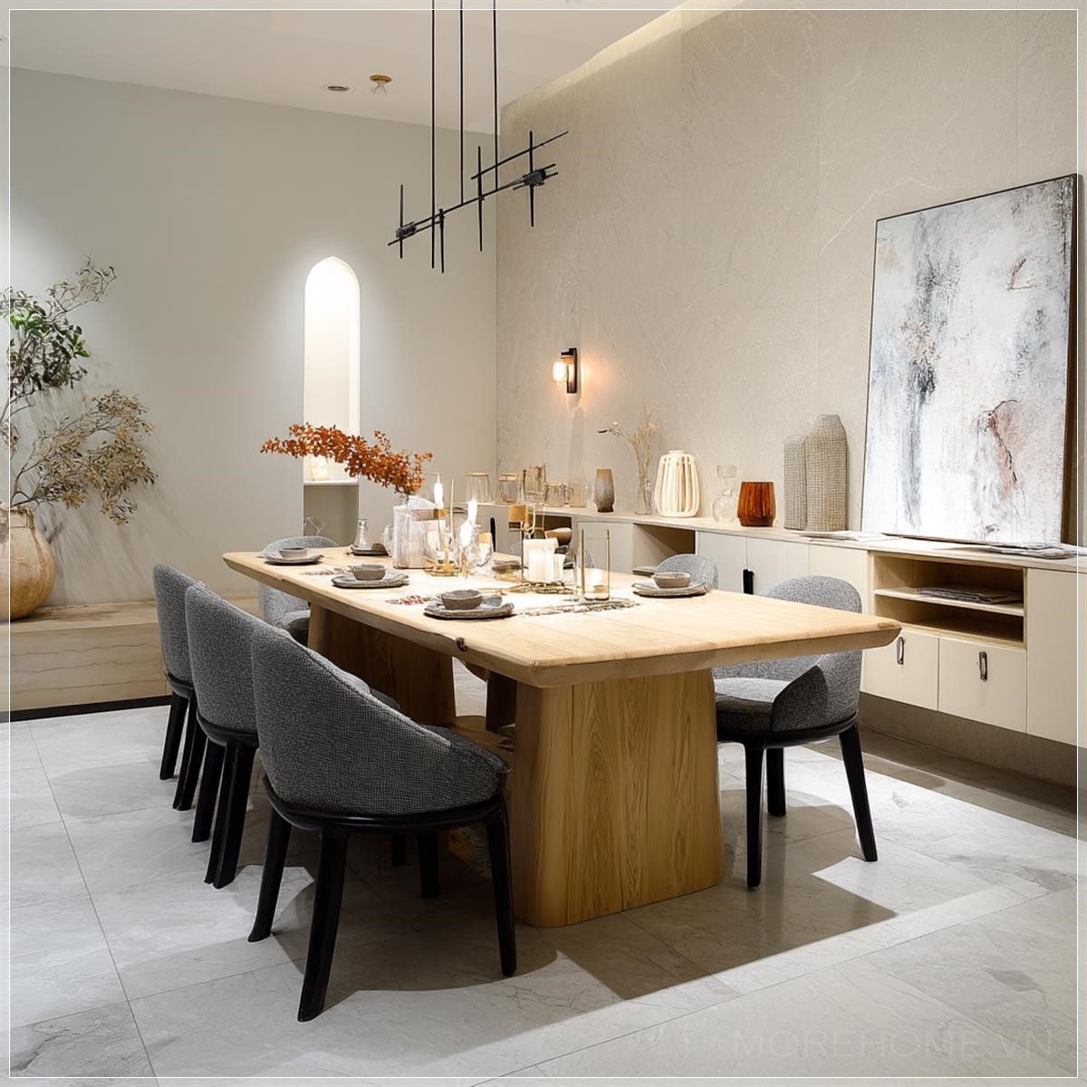 Trung tâm của nhà hàng là chiếc bàn ăn hình chữ nhật với tông màu gỗ sáng, được bao quanh bởi sáu chiếc ghế bọc vải màu xám đậm thanh lịch. Trên bàn, những món đồ gốm sứ tinh xảo, bình hoa thủy tinh và nến thơm tạo nên không khí trang trọng cho mỗi bữa ăn. Những chi tiết nhỏ này biến việc ăn uống từ nhu cầu hàng ngày thành một nghi thức thưởng thức đầy nghệ thuật.