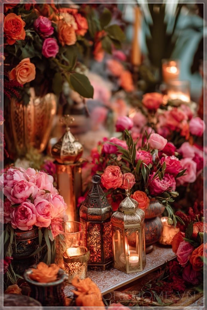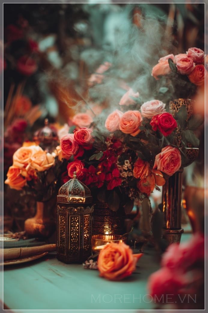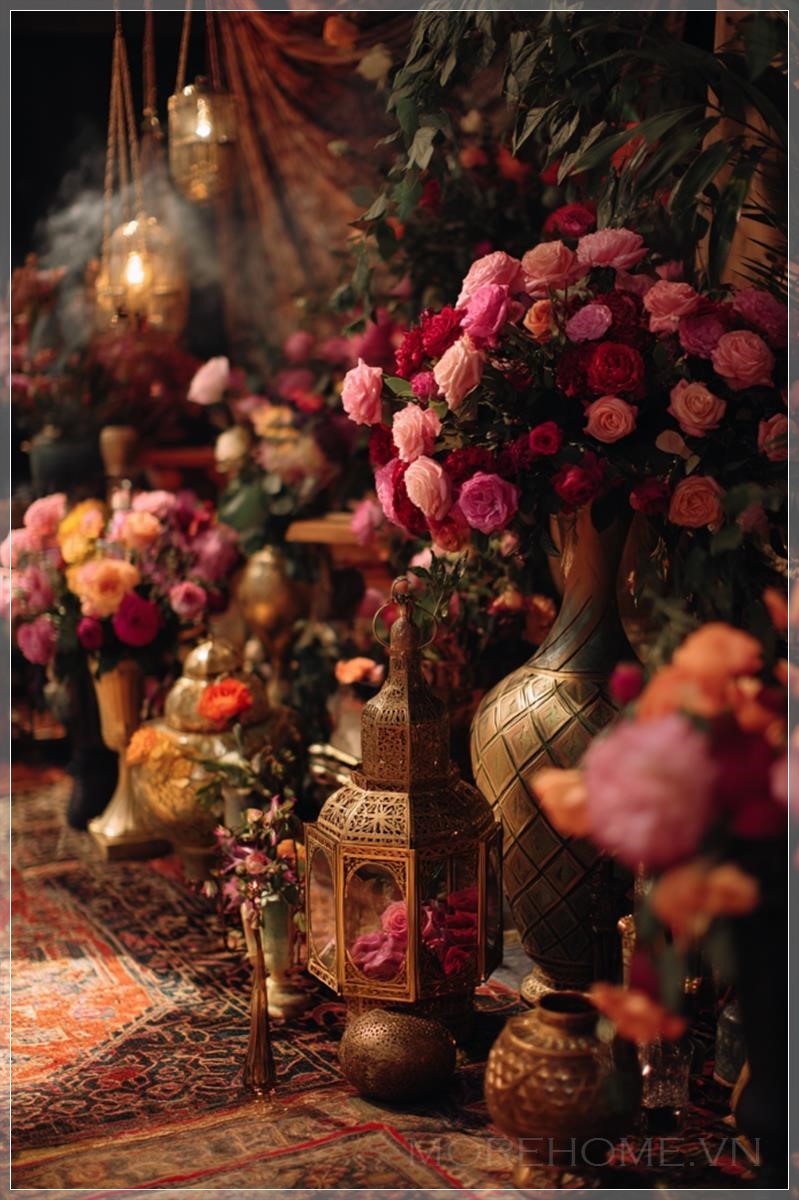 Giữa khu vườn của những sắc màu rực rỡ, những chiếc đèn lồng Ả Rập tinh xảo được treo lơ lửng, với những họa tiết hoa văn phức tạp được chạm khắc tỉ mỉ. Ánh sáng mỏng manh thoát ra từ bên trong, tạo nên những hình bóng huyền ảo trên mặt đất, như thể kể những câu chuyện cổ tích từ thời xa xưa. Khói trầm mỏng nhẹ nhàng bay lên, mang theo mùi hương của gỗ đàn hương và hoa hồng, tạo nên không gian thiền định an yên, đưa tâm hồn về miền xa xôi của những đêm Ả Rập ngàn lẻ một đêm.