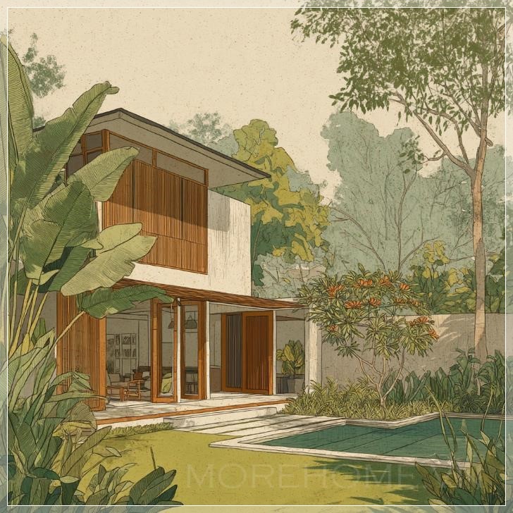 Ánh nắng vàng ươm của buổi sáng len lỏi qua những tán lá xanh mướt, tạo nên những vệt sáng lung linh trên mặt nước hồ bơi trong xanh. Ngôi nhà phong cách Bali đương đại này không chỉ là một không gian sống, mà còn là một tác phẩm nghệ thuật hòa quyện hoàn hảo giữa kiến trúc hiện đại và vẻ đẹp nguyên sơ của thiên nhiên nhiệt đới.