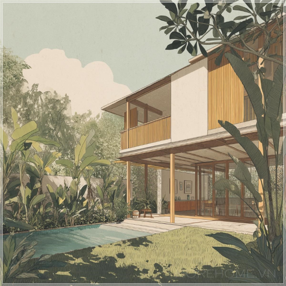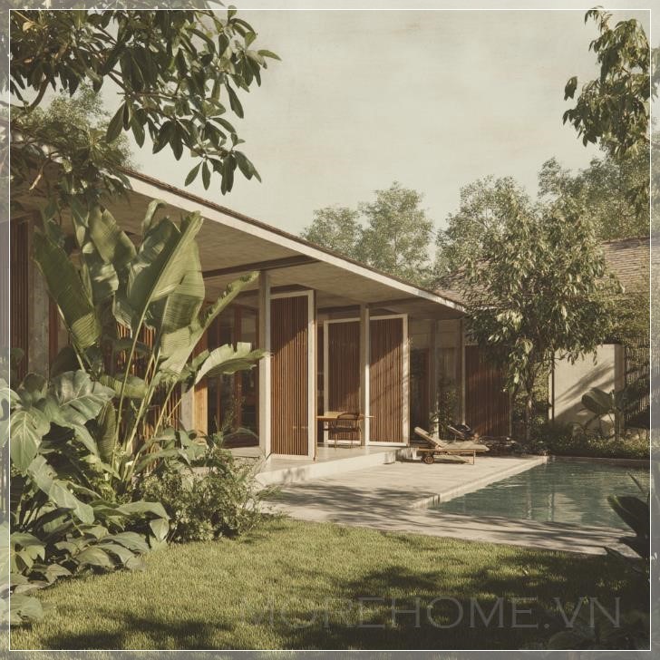 Khi đêm xuống, ánh đèn vàng ấm từ trong nhà tỏa ra ngoài, tạo ra một khung cảnh ấm cúng và mời gọi. Tiếng côn trùng đêm hòa cùng tiếng nước chảy nhẹ từ hồ bơi tạo nên bản nhạc ru ngủ tự nhiên. Đây không chỉ là một ngôi nhà, mà là một ốc đảo bình yên giữa cuộc sống hiện đại hối hả, nơi con người có thể tìm lại sự cân bằng và kết nối với thiên nhiên một cách chân thật nhất.