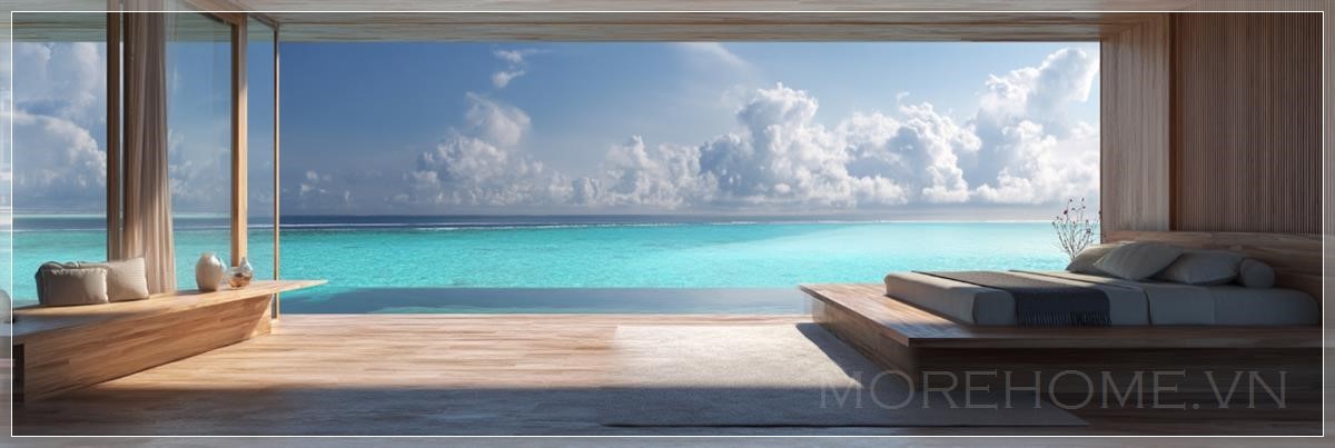Những cánh cửa kính lớn trải dài từ sàn đến trần tạo nên một bức tranh thiên nhiên sống động, nơi làn nước ngọc lam của đại dương Maldives hòa quyện cùng bầu trời xanh thăm thẳm. Chính sự kết nối trực tiếp này với thiên nhiên đã tạo nên linh hồn cho căn phòng, khiến ranh giới giữa không gian trong nhà và ngoài trời trở nên mờ nhạt một cách tinh tế.