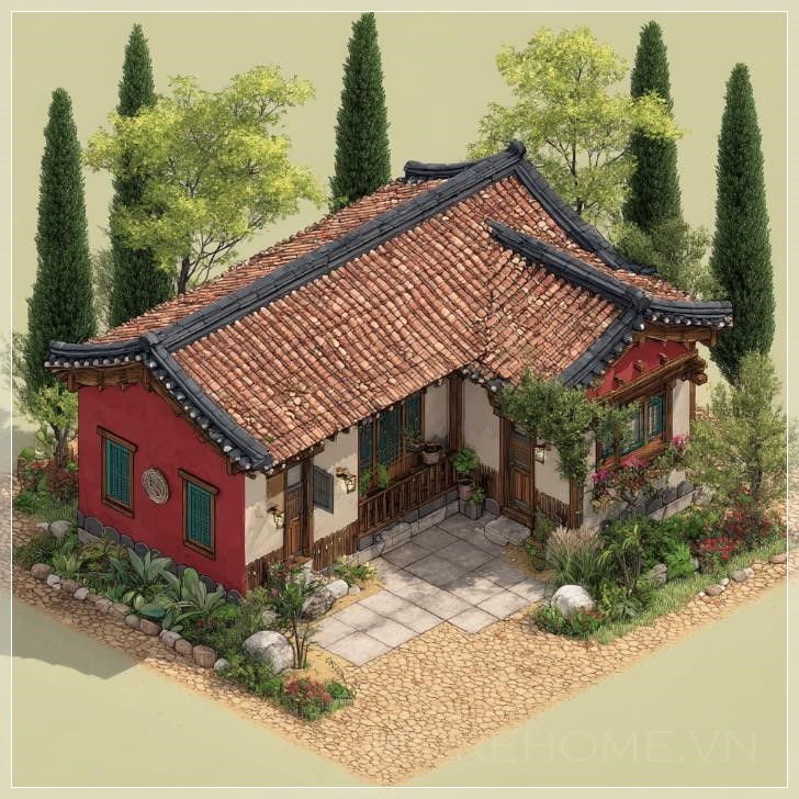 Không thể không nhắc đến khu vườn xung quanh ngôi nhà - một tác phẩm landscape design đầy cảm hứng. Những cây cypress cao vút được trồng thành hàng, tạo nên một bức tường xanh tự nhiên vừa che chắn gió bụi vừa mang đến sự riêng tư cần thiết. Dưới tán lá xanh mướt, các lối đi lát đá tự nhiên uốn lượn dẫn đến những góc nghỉ nhỏ, nơi đặt những chiếc ghế gỗ đơn giản theo phong cách hanok, mời gọi du khách dừng chân thưởng thức ly trà chiều trong không gian yên tĩnh.