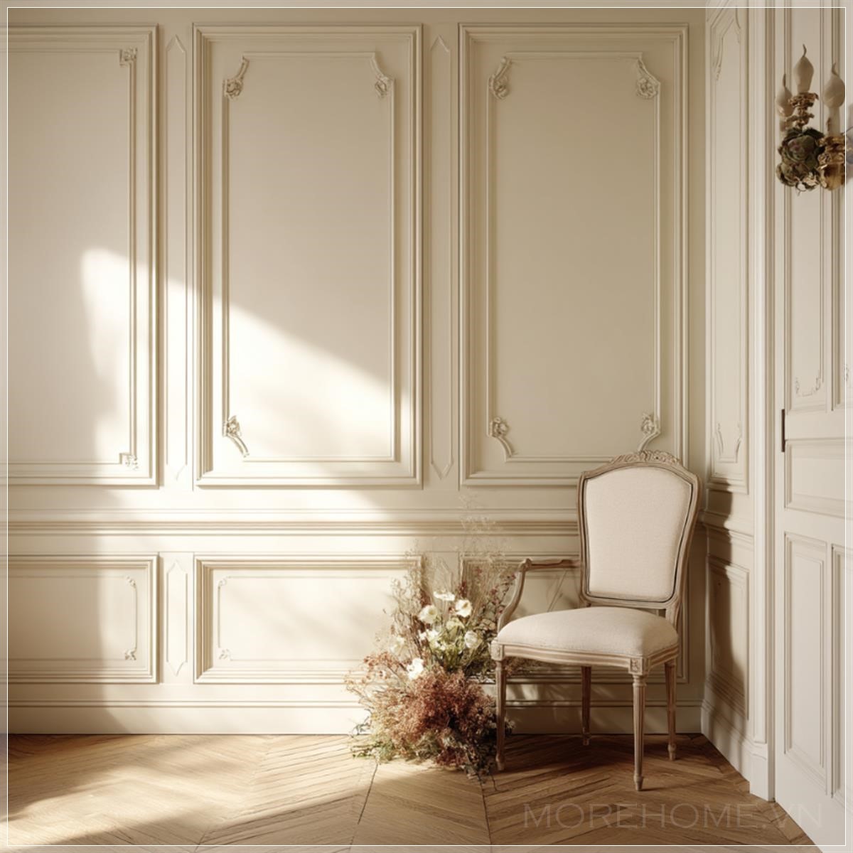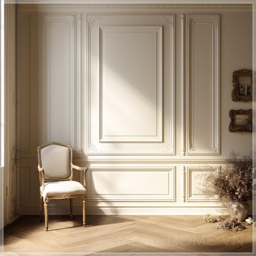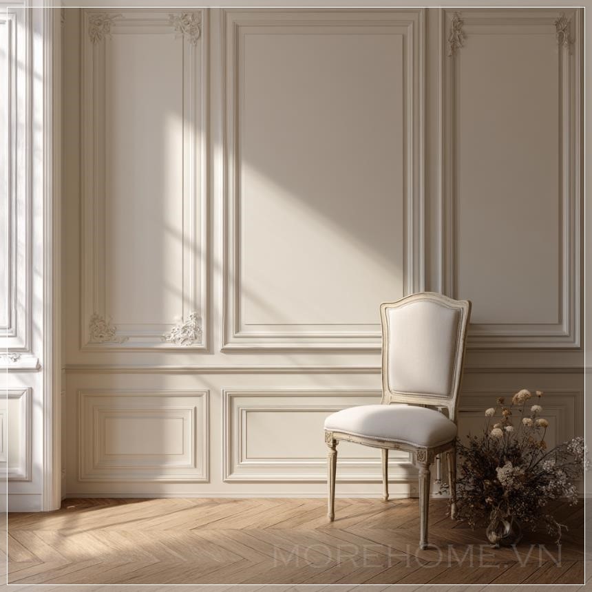 Bước vào không gian này, ánh mắt ngay lập tức bị cuốn hút bởi những đường chỉ trang trí cổ điển được chạm khắc tinh xảo trên bức tường. Những đường nét này không chỉ đơn thuần là yếu tố trang trí, mà còn là minh chứng cho nghệ thuật kiến trúc Pháp đã được trau chuốt qua nhiều thế kỷ. Màu sắc được lựa chọn một cách tỉ mỉ - sắc trắng vỏ trứng pha lẫn tông ngà ấm áp - tạo nên một bảng màu nhẹ nhàng nhưng không kém phần sang trọng.