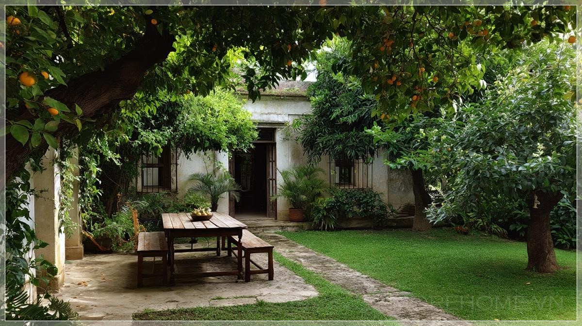 Bước chân ra khỏi cửa sau, bạn sẽ được chào đón bởi một không gian xanh mát rượi, nơi những tán cây sum suê vươn cao như những chiếc ô khổng lồ che chở cho khu vườn nhỏ. Đây không chỉ đơn thuần là một sân sau, mà còn là linh hồn của ngôi nhà, nơi thiên nhiên và cuộc sống hòa quyện một cách hoàn hảo.