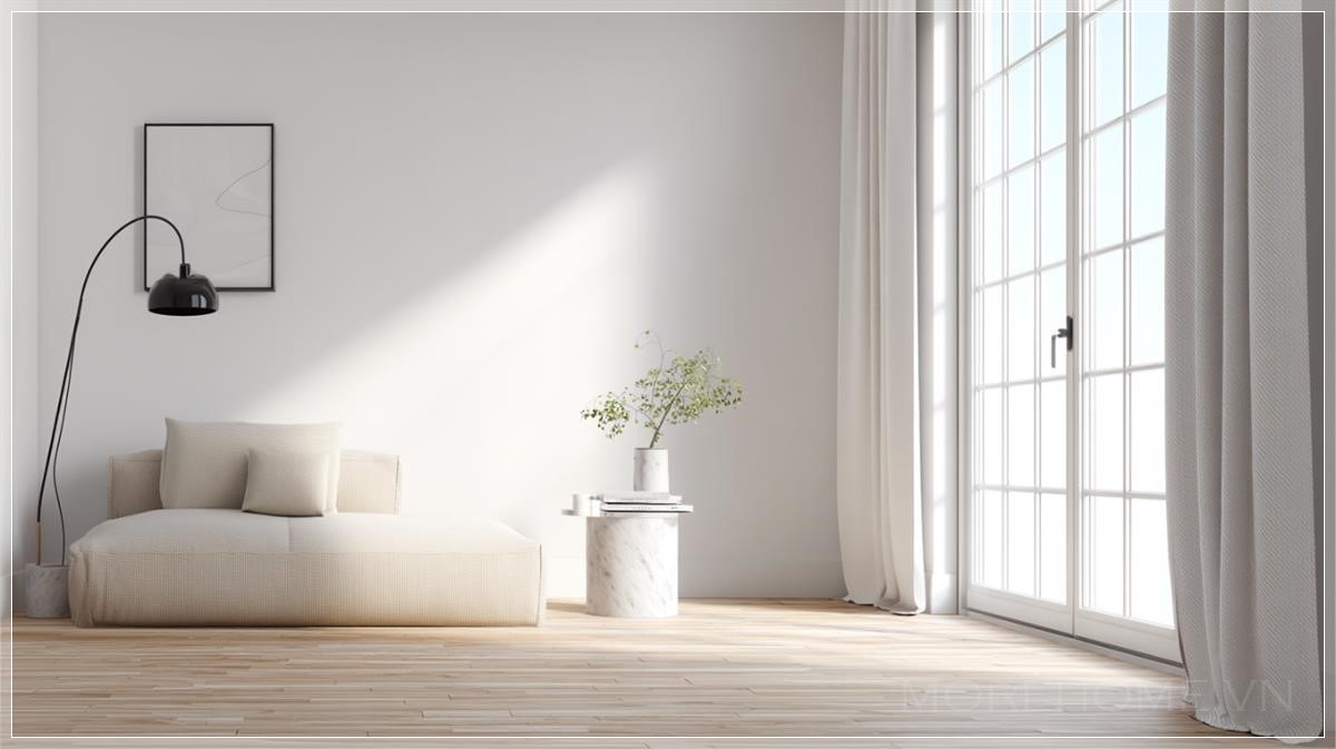 Ánh sáng buổi sáng len lỏi qua những tấm rèm, tạo ra những dải bóng gradient tinh tế trên những bức tường trắng mờ. Chính những bức tường này, với màu trắng không hoàn toàn thuần khiết mà hơi pha chút sắc thái ấm áp, đã trở thành canvas hoàn hảo cho trò chơi ánh sáng và bóng tối diễn ra suốt cả ngày. Mỗi khoảnh khắc, từ bình minh đến hoàng hôn, không gian này lại khoác lên mình một chiếc áo mới, một cảm xúc mới.