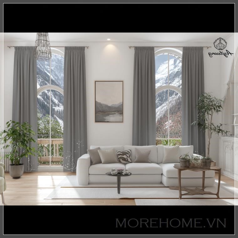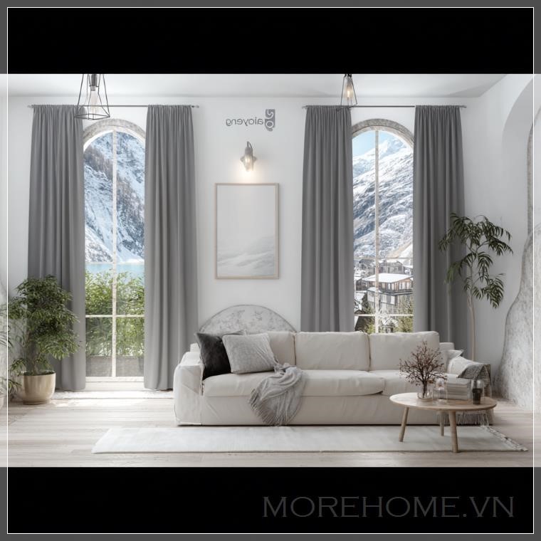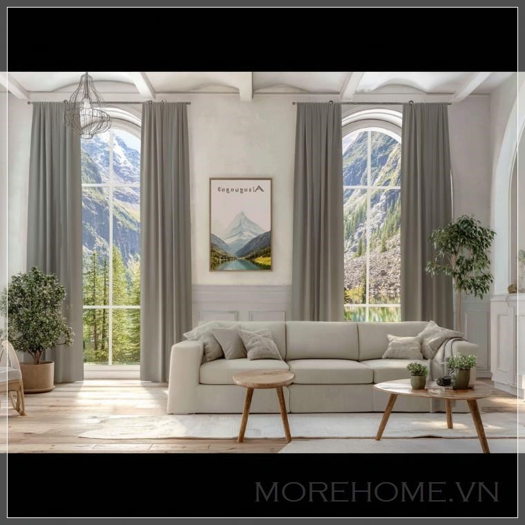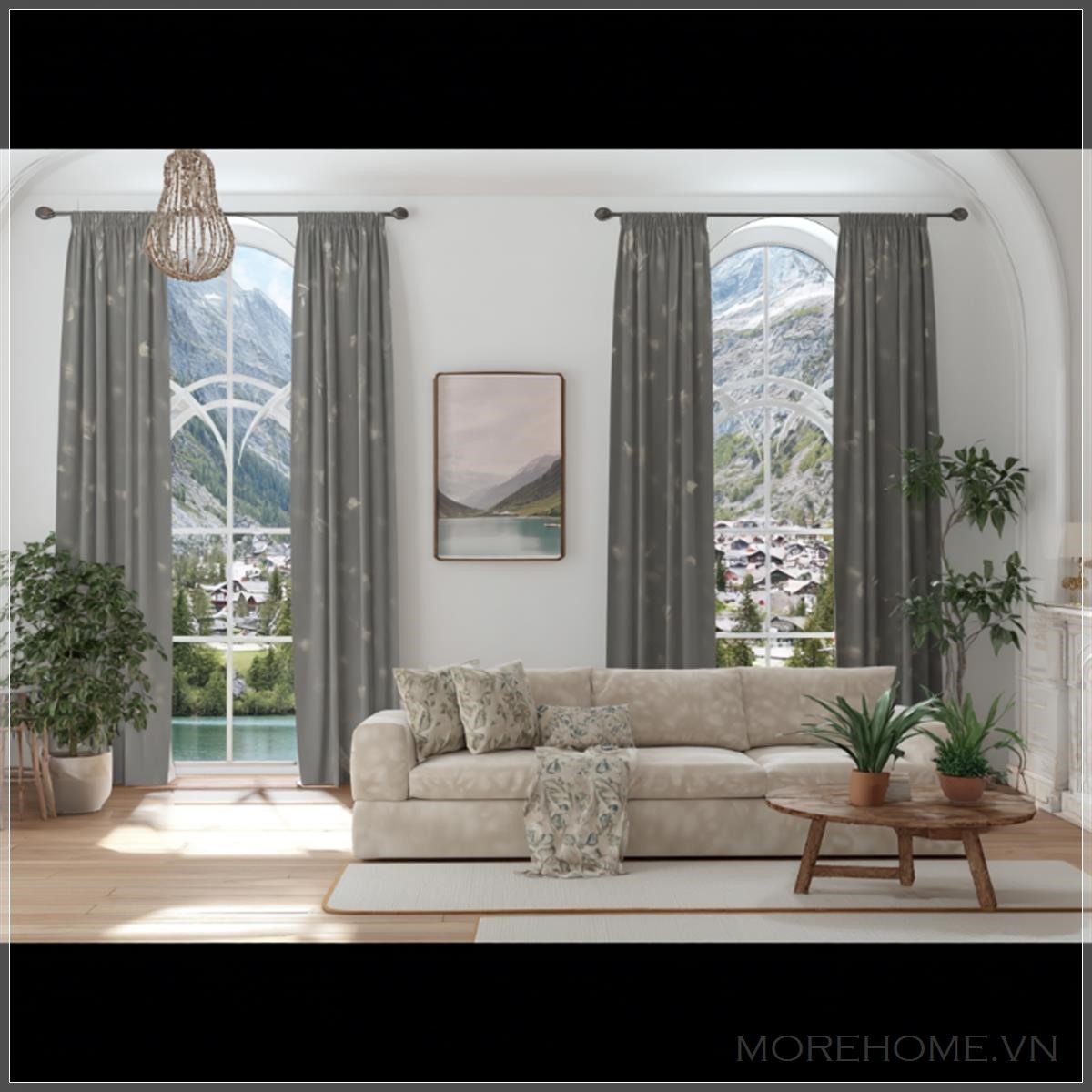 Những tấm rèm cửa màu trắng xám với họa tiết thêu tinh xảo trở thành tâm điểm của không gian, chúng được treo cẩn thận trước những ô cửa sổ hình vòm cao từ sàn lên trần. Chất liệu vải cao cấp với kết cấu sợi tự nhiên tạo nên những nếp gấp mềm mại, như những làn sóng nhẹ nhàng đung đưa trong gió núi. Màu sắc trung tính này không chỉ tôn lên vẻ đẹp cổ điển mà còn tạo ra sự cân bằng hoàn hảo với khung cảnh thiên nhiên bên ngoài.