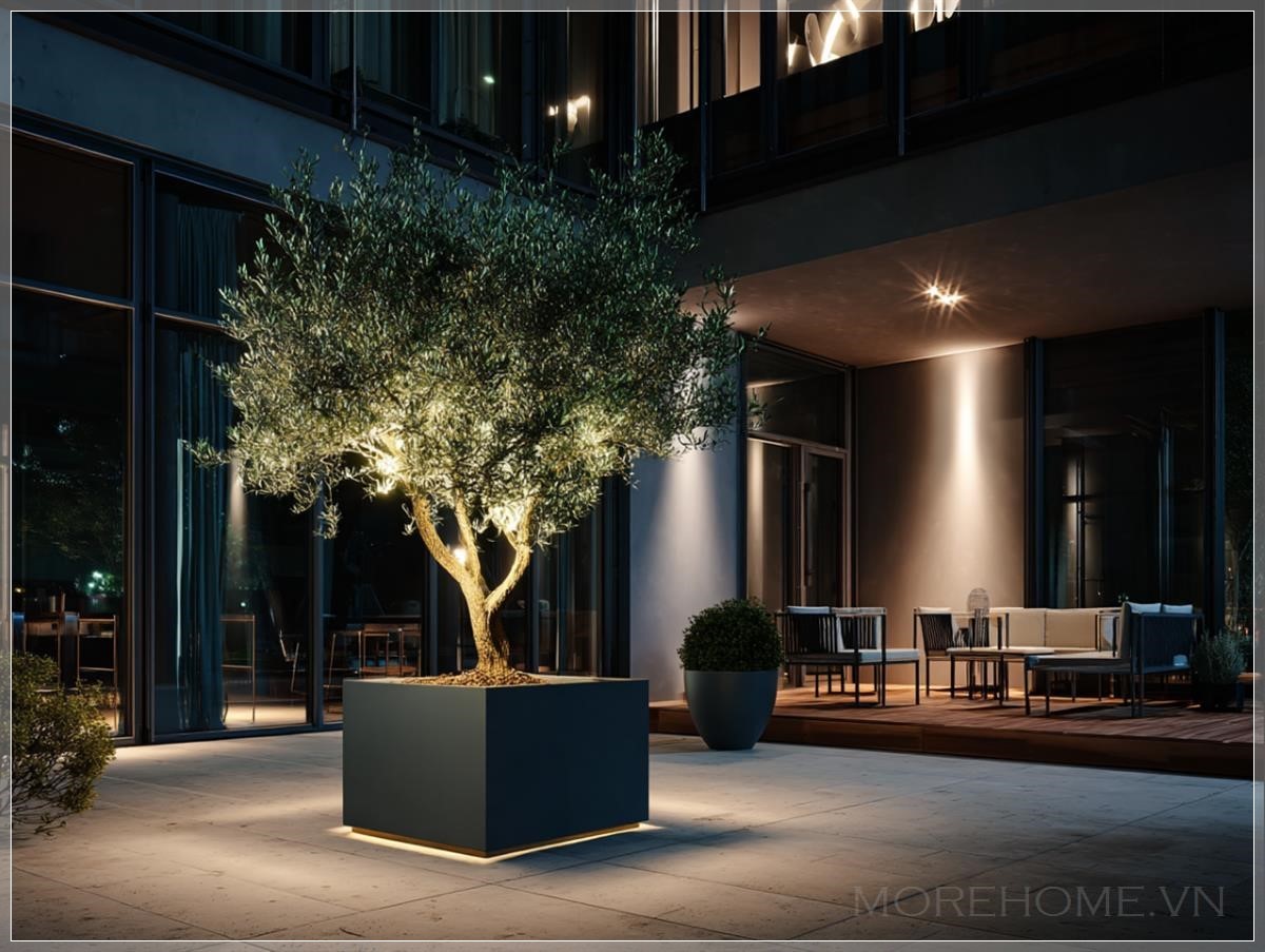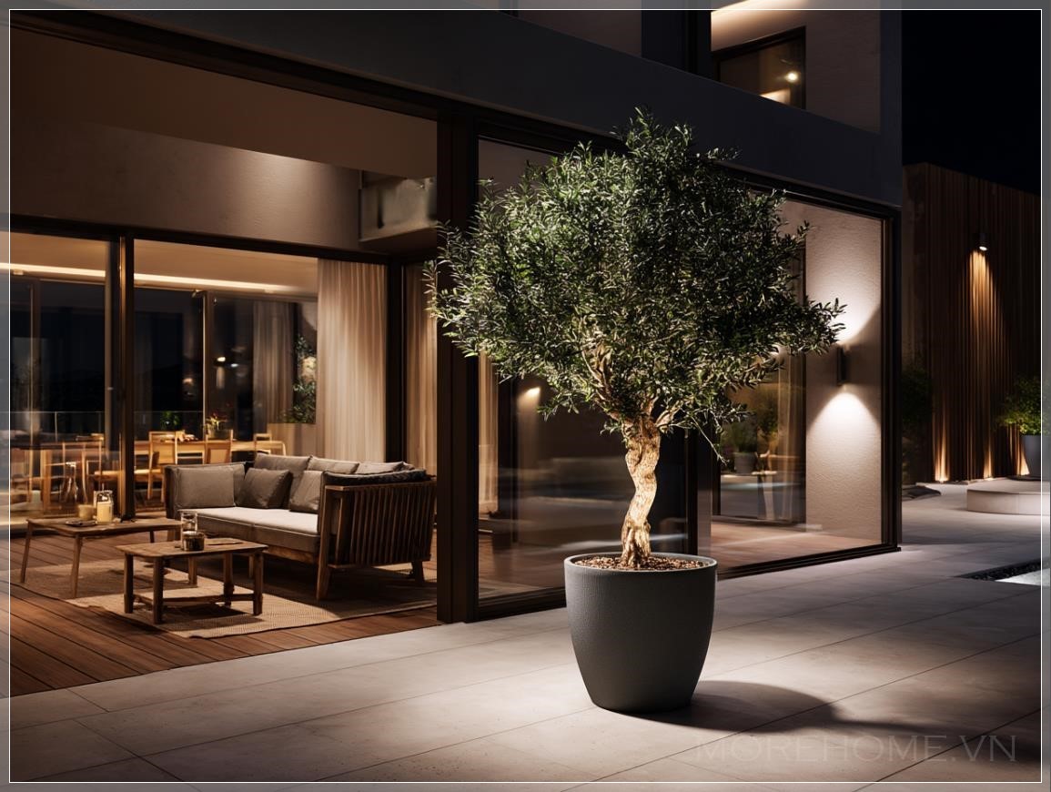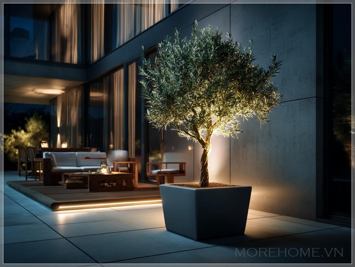 Giữa không gian yên tĩnh của một đêm mát mẻ tại Đức, một cây ô liu tuyệt đẹp đứng vững trong một chậu trồng màu xám antraxit, làm nổi bật vẻ đẹp của nó trên nền sân thượng hiện đại. Ánh sáng mềm mại, ấm áp từ dưới lên chiếu sáng cây, tạo ra những bóng đổ nhẹ nhàng trên bức tường phía sau. Mỗi chiếc lá của cây ô liu như được vẽ lên bằng ánh sáng, nổi bật giữa không gian tĩnh lặng của đêm.